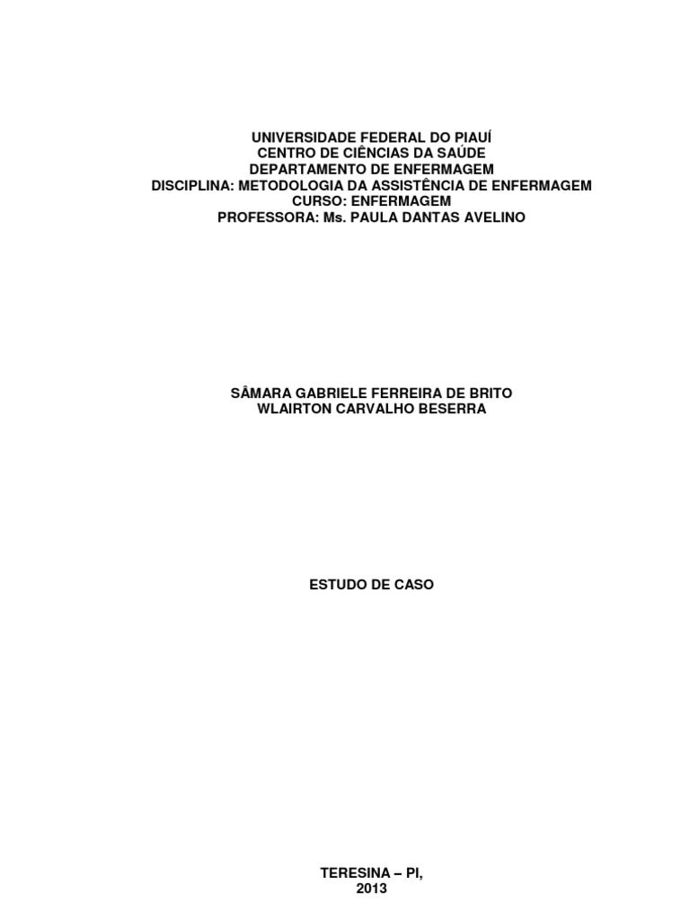 A realizao do estudo de caso empregada pela disciplina Metodologia Cientfica da Assistncia de Enfermagem, proporcionou a implementao do processo de enfermagem, estabelecendo a real importncia do contato discenteSAE, contribuindo para um maior conhecimento do ser humano no contexto sadedoena, suas necessidades, estabelecendo diagnsticos, metas e intervenes para que se pudesse avaliar e contribuir com conhecimento cientfico, prtico e tico perante as circunstncias particulares de cada indivduo. Alcanando-se assim, os objetivos estabelecidos e atestando ainda mais a importncia do enfermeiro na promoo, manuteno e restaurao da sade do indivduo, englobando o seu bem estar fsico e mental. Logo, o contato inicial do discente com a sistematizao de enfermagem em suas prticas hospitalares, potencializa seu aprendizado, garantindo segurana na tomada de decises quanto profissional subsequentemente sua vida acadmica.