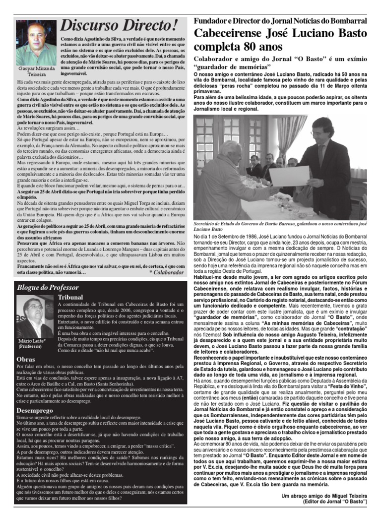devem, o José Luciano Basto passou a fazer parte da nossa grande família de leitores e colaboradores. Reconhecendo o papel importante e insubstituível que este nosso conterrâneo prestou à Imprensa Regional, o Governo, através do respectivo Secretário de Estado da tutela, galardoou e homenageou o José Luciano pelo contributo dado ao longo de toda uma vida, ao jornalismo e à imprensa regional. Há anos, quando desempenhei funções públicas como Deputado à Assembleia da República, e me desloquei à linda vila do Bombarral para visitar a “Festa do Vinho”, certame de grande qualidade que se realiza anualmente, perguntei pelo meu conterrâneo aos meus (então) camaradas de partido daquele concelho e tive pena de não ter estado com o José Luciano. Fiz questão de visitar o pavilhão do Jornal Notícias do Bombarral e já então constatei o apreço e a consideração que os Bombarralenses, independentemente das cores partidárias têm pelo José Luciano Basto, pessoa cativante e de feitio afável, conhecida de todos naquela vila. Fiquei como é óbvio orgulhoso enquanto cabeceirense, ao ver que toda a gente gostava e apreciava o trabalho cívico e jornalístico prestado pelo nosso amigo, à sua terra de adopção. Ao comemorar 80 anos de vida, não podemos deixar de lhe enviar os parabéns pelo seu aniversário e o nosso sincero reconhecimento pela prestimosa colaboração que tem prestado ao Jornal “O Basto”. Enquanto Editor deste Jornal e em nome de todos os que aqui trabalham, queremos exprimir-lhe a nossa maior estima por V. Ex.cia, desejando-lhe muita saúde e que Deus lhe dê muita força para continuar por muitos mais anos a prestigiar o jornalismo e a imprensa regional como o tem feito, enviando-nos mensalmente as crónicas sobre o passado de Cabeceiras, que V. Ex.cia tão bem guarda na memória.