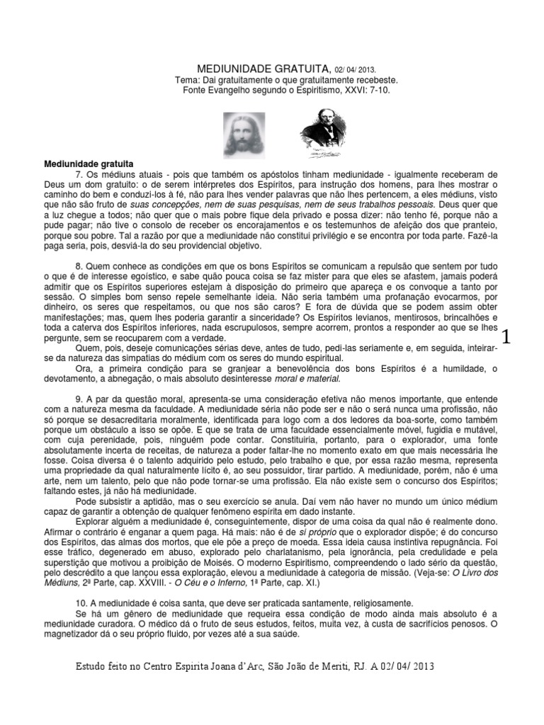 Estudo feito no Centro Espirita Joana dArc, So Joo de Meriti, RJ. A 02/ 04/ 2013
