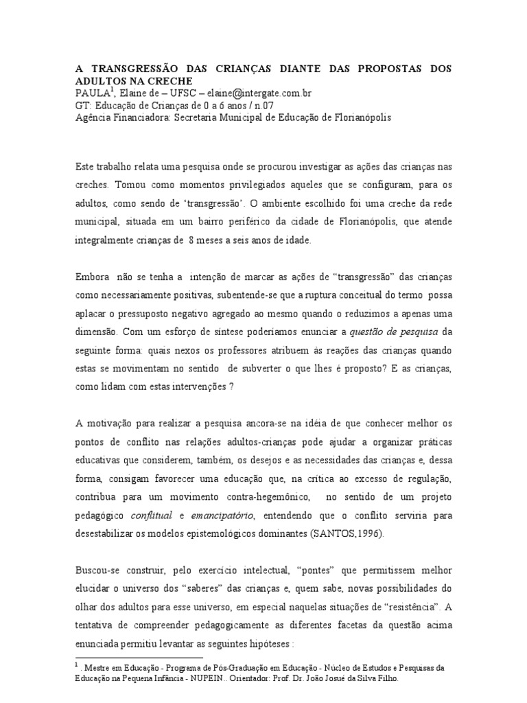 br GT: Educação de Crianças de 0 a 6 anos / n.07 Agência Financiadora: Secretaria Municipal de Educação de Florianópolis