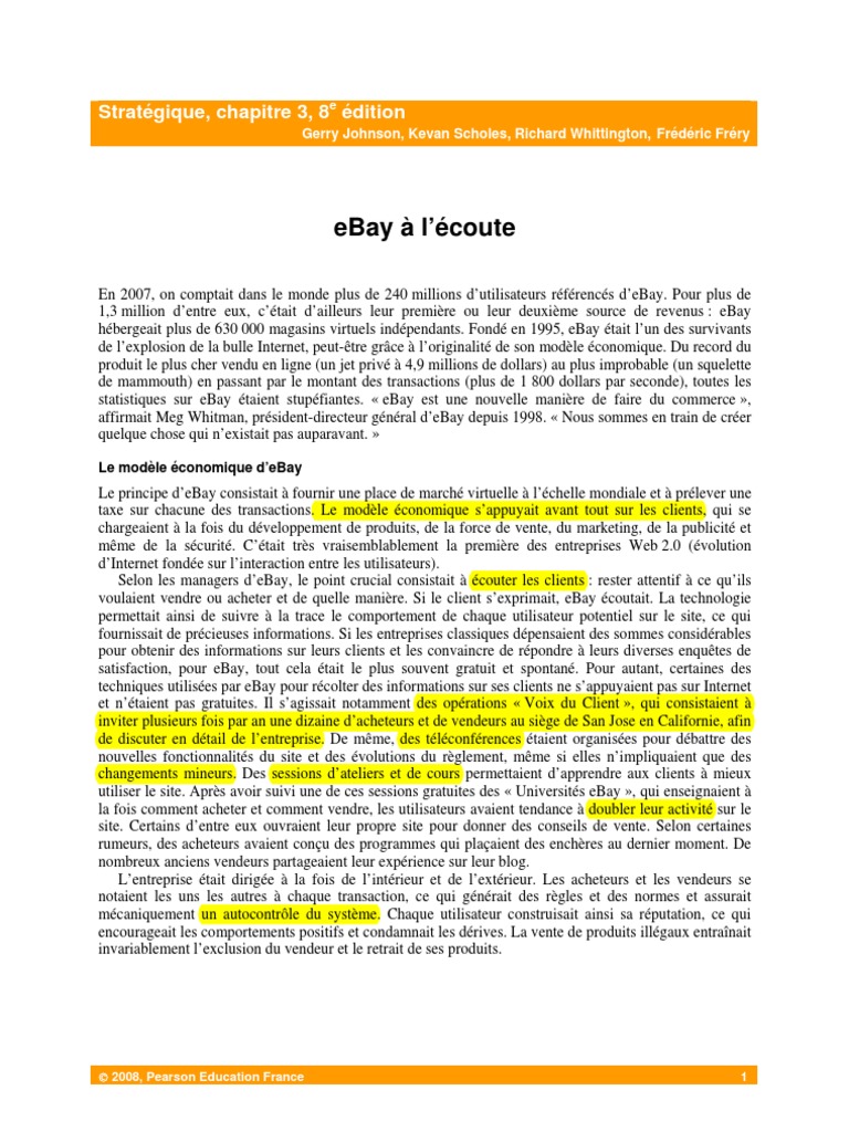 1. 2. 3. En utilisant les outils prsents dans ce chapitre, analysez la capacit stratgique deBay. Quelles ressources et comptences ont permis eBay dobtenir un avantage concurrentiel et pourquoi ? En utilisant la notion de capacits dynamiques, que proposeriez-vous pour faire voluer la capacit stratgique deBay (tendre, crer ou acheter de nouvelles ressources et comptences, en vendre dautres, etc.) tant donn : (a) Larrive de nouveaux entrants ? (b) Lvolution du concept deBay ?