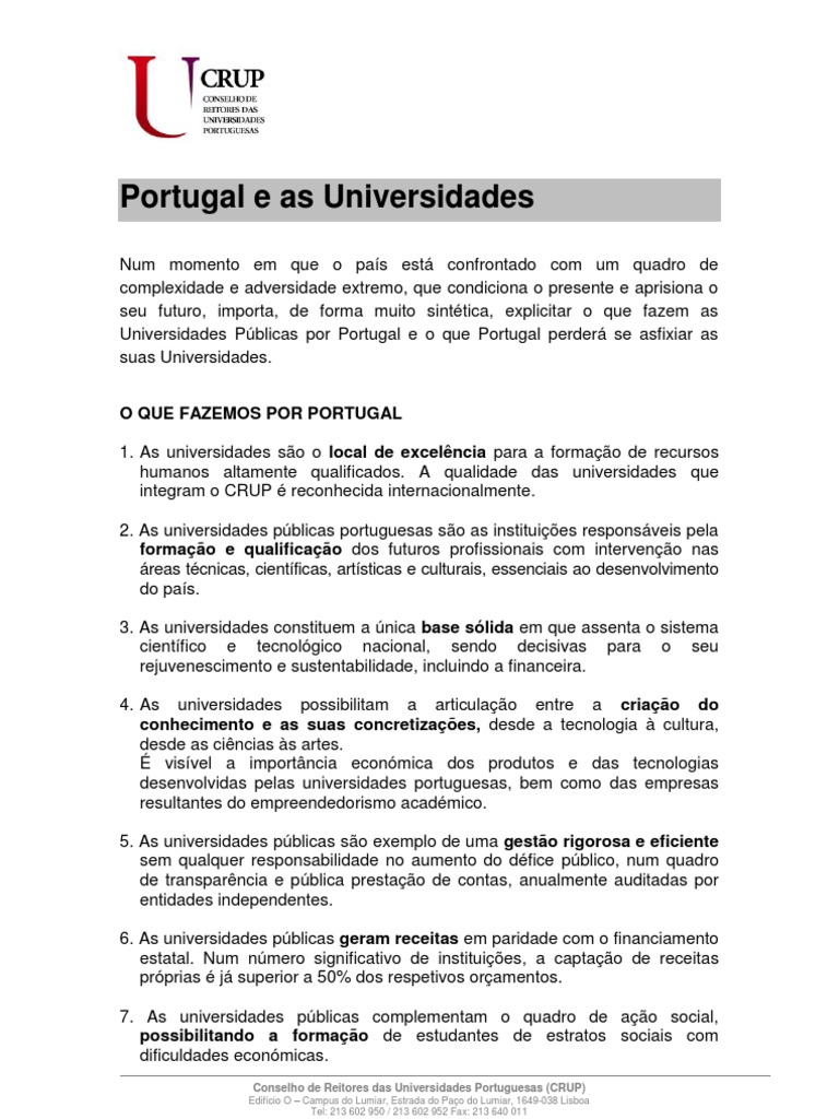 Num momento em que o pas est confrontado com um quadro de complexidade e adversidade extremo, que condiciona o presente e aprisiona o seu futuro, importa, de forma muito sinttica, explicitar o que fazem as Universidades Pblicas por Portugal e o que Portugal perder se asfixiar as suas Universidades. O QUE FAZEMOS POR PORTUGAL 1. As universidades so o local de excelncia para a formao de recursos humanos altamente qualificados. A qualidade das universidades que integram o CRUP reconhecida internacionalmente. 2. As universidades pblicas portuguesas so as instituies responsveis pela formao e qualificao dos futuros profissionais com interveno nas reas tcnicas, cientficas, artsticas e culturais, essenciais ao desenvolvimento do pas. 3. As universidades constituem a nica base slida em que assenta o sistema cientfico e tecnolgico nacional, sendo decisivas para o seu rejuvenescimento e sustentabilidade, incluindo a financeira. 4. As universidades possibilitam a articulao entre a criao do conhecimento e as suas concretizaes, desde a tecnologia cultura, desde as cincias s artes. visvel a importncia econmica dos produtos e das tecnologias desenvolvidas pelas universidades portuguesas, bem como das empresas resultantes do empreendedorismo acadmico. 5. As universidades pblicas so exemplo de uma gesto rigorosa e eficiente sem qualquer responsabilidade no aumento do dfice pblico, num quadro de transparncia e pblica prestao de contas, anualmente auditadas por entidades independentes. 6. As universidades pblicas geram receitas em paridade com o financiamento estatal. Num nmero significativo de instituies, a captao de receitas prprias j superior a 50% dos respetivos oramentos. 7. As universidades pblicas complementam o quadro de ao social, possibilitando a formao de estudantes de estratos sociais com dificuldades econmicas.