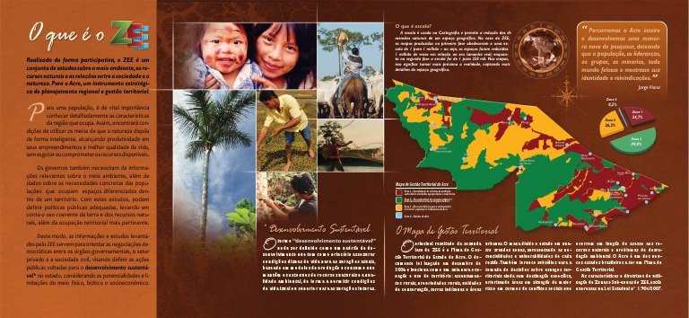 Realizado de forma participativa, o ZEE um conjunto de estudos sobre o meio ambiente, os recursos naturais e as relaes entre a sociedade e a natureza. Para o Acre, um instrumento estratgico de planejamento regional e gesto territorial.