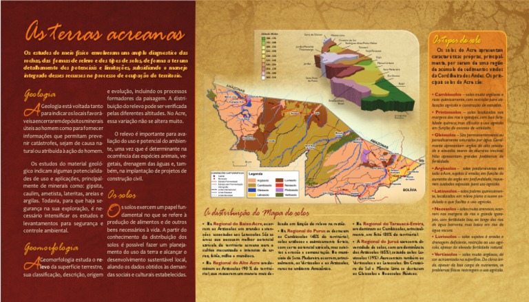 e evoluo, incluindo os processos formadores da paisagem. A distriGeologia est voltada tanto buio do relevo pode ser verificada para indicar os locais favor- pelas diferentes altitudes. No Acre, veis a encerrarem depsitos minerais essa variao no se altera muito. teis ao homem como para fornecer O relevo importante para avainformaes que permitam prevenir catstrofes, sejam de causa na- liao do uso e potencial do ambientural ou atribuda ao do homem. te, uma vez que determinante na ocorrncia das espcies animais, veOs estudos do material geol- getais, drenagem das guas e, tamgico indicam algumas potencialida- bm, na implantao de projetos de des de uso e aplicaes, principal- construo civil. mente de minerais como: gipsita, caulim, ametista, lateritas, areias e argilas. Todavia, para que haja ses solos exercem um papel fungurana na sua explorao, nedamental no que se refere cessrio intensificar os estudos e levantamentos para segurana e produo de alimentos e de outros bens necessrios vida. A partir do controle ambiental. conhecimento da distribuio dos solos possvel fazer um planejamento do uso da terra e alcanar o Geomorfologia estuda o re- desenvolvimento sustentvel local, levo da superfcie terrestre, aliando os dados obtidos s demansua classificao, descrio, origem das sociais e culturais estabelecidas.