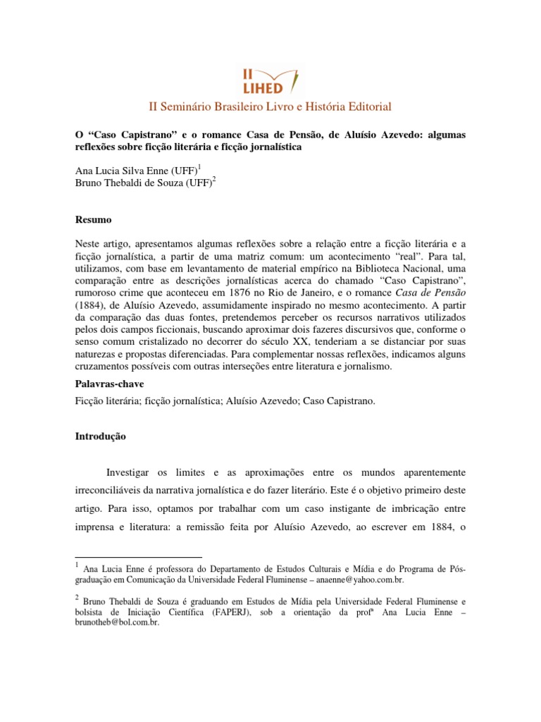 O Caso Capistrano e o romance Casa de Penso, de Alusio Azevedo: algumas reflexes sobre fico literria e fico jornalstica Ana Lucia Silva Enne (UFF)1 Bruno Thebaldi de Souza (UFF)2
