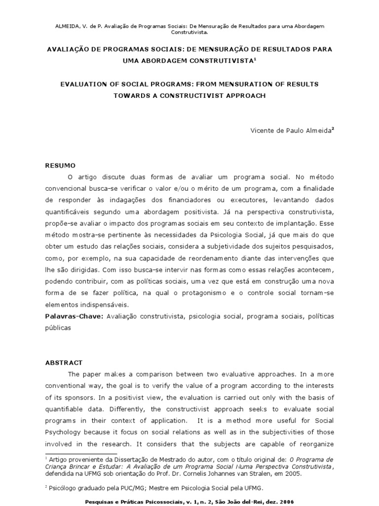 ALMEIDA, V. de P. Avaliao de Programas Sociais: De Mensurao de Resultados para uma Abordagem Construtivista.
