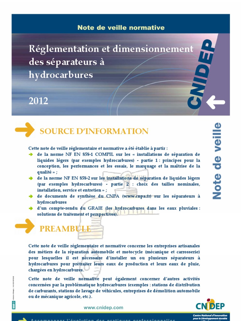 Cette note de veille rglementaire et normative a t tablie partir : de la norme NF EN 858-1 COMPIL sur les installations de sparation de liquides lgers (par exemples hydrocarbures) - partie 1 : principes pour la conception, les performances et les essais, le marquage et la matrise de la qualit ; de la norme NF EN 858-2 sur les installations de sparation de liquides lgers (par exemples hydrocarbures) - partie 2 : choix des tailles nominales, installation, service et entretien ; de documents de synthse du CNPA (www.cnpa.fr) sur les sparateurs hydrocarbures dun compte-rendu du GRAIE (les hydrocarbures dans les eaux pluviales : solutions de traitement et perspectives).