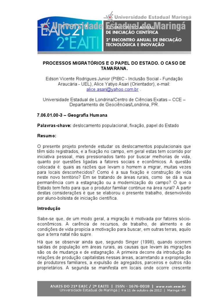 Edson Vicente Rodrigues Junior (PIBIC - Incluso Social - Fundao Araucria - UEL), Alice Yatiyo Asari (Orientador), e-mail: alice.asari@yahoo.com.br . Universidade Estadual de Londrina/Centro de Cincias Exatas CCE Departamento de Geocincias/Londrina, PR. 7.06.01.00-3 Geografia Humana Palavras-chave: deslocamento populacional, fixao, papel do Estado Resumo: O presente projeto pretende estudar os deslocamentos populacionais que tm sido registrados, e a fixao no campo, em geral estas tem ocorrido por iniciativa pessoal, mas pressionados tanto por buscar melhorias de vida, quanto por questes ligadas a fatores sociais e econmicos. A questo colocada : quais as razes que levam o homem a migrar, muitas vezes para locais desconhecidos? Como a sua fixao e construo de vida neste novo territrio? Em se tratando de reas rurais, como se d a sua permanncia com a estagnao ou a modernizao do campo? O que o Estado tem feito para que o produtor familiar continue na rea rural? A partir destas consideraes que se elaborou o presente trabalho, desenvolvido por aluno-bolsista de iniciao cientfica. Introduo Sabe-se que, de um modo geral, a migrao motivada por fatores scioeconmicos. A carncia de recursos, de trabalho, de alimento e de condies de vida propicia a motivao para buscar, em outras terras, aquilo que a terra natal no supre. H que se observar ainda que, segundo Singer (1998), quando ocorrem sadas de populao em reas rurais, as causas que levam s migraes so os de mudana e de estagnao. A primeira decorre da introduo de relaes de produo capitalistas nessas reas, acarretando a expropriao de produtores familiares, a expulso de agregados, parceiros e outros no proprietrios. A segunda se manifesta em locais onde ocorre crescente