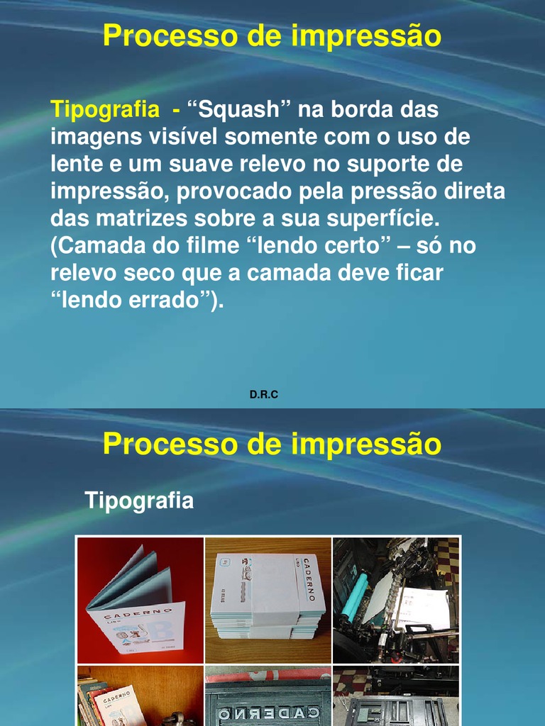 Tipografia - “Squash” na borda das imagens visível somente com o uso de lente e um suave relevo no suporte de impressão, provocado pela pressão direta das matrizes sobre a sua superfície. (Camada do filme “lendo certo” – só no relevo seco que a camada deve ficar “lendo errado”).