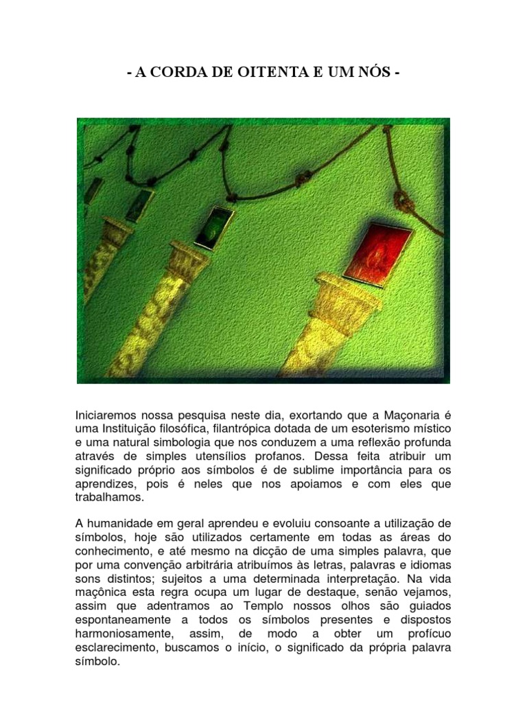 Depois de analisada a natureza dos símbolos, a disposição simbólica da “corda de oitenta e um laços” no Templo, assim como sua origem nesta sublime Instituição passemos a uma retida análise consoante ao