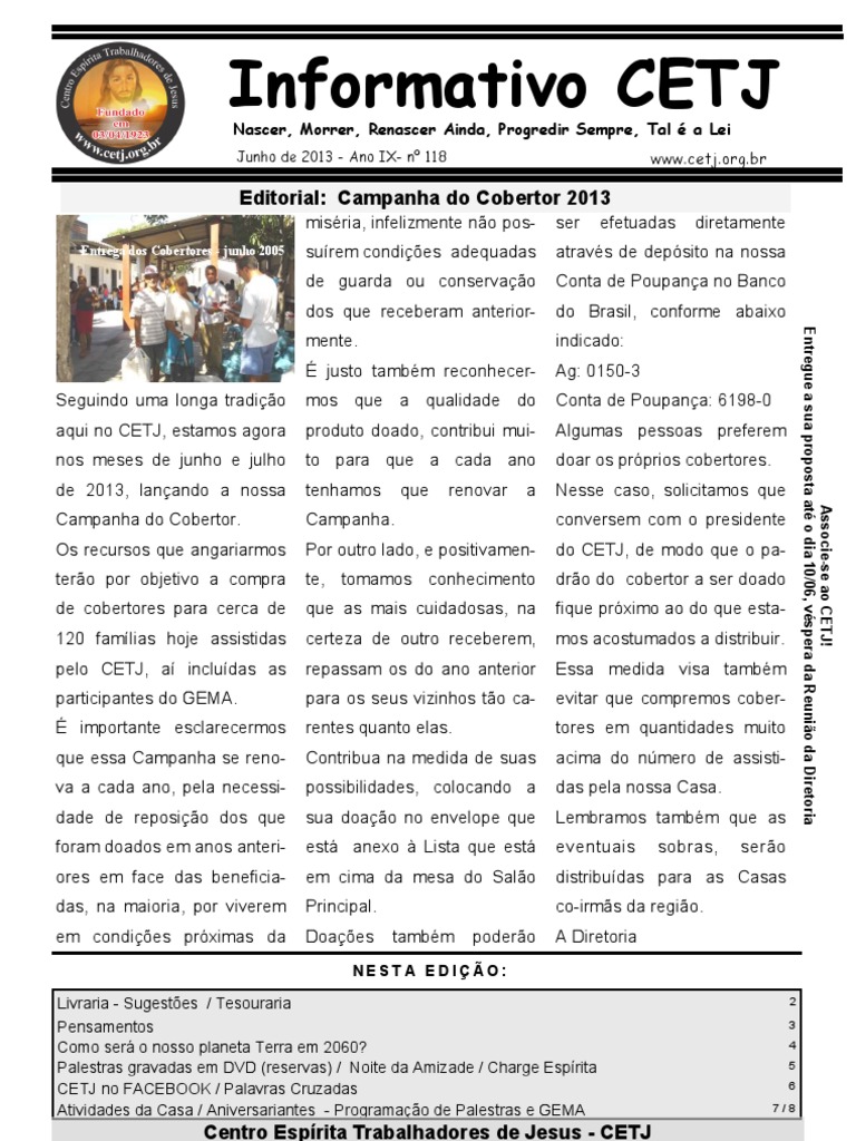NEST A ED I O : Livraria - Sugestes / Tesouraria Pensamentos Como ser o nosso planeta Terra em 2060? Palestras gravadas em DVD (reservas) / Noite da Amizade / Charge Esprita CETJ no FACEBOOK / Palavras Cruzadas Atividades da Casa / Aniversariantes - Programao de Palestras e GEMA