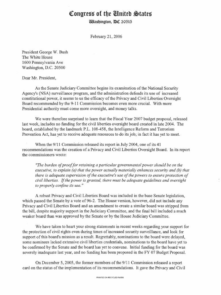 February 2 1,2006President George W. BushThe White House1600 Pennsylvania AveWashington, D.C. 20500Dear Mr. President,As the Senate Judiciary Committee begins its examination of the National SecurityAgency's (NSA) surveillance program, and the administration defends its use of increasedconstitutional power, it seems to us the efficacy of the Privacy and Civil Liberties OversightBoard recommended by the 9-1 1 Commission becomes even more crucial. With morePresidential authority must come more oversight, and money talks.We were therefore surprised to learn that the Fiscal Year 2007 budget proposal, releasedlast week, includes no hnding for the civil liberties oversight board created in late 2004. Theboard, established by the landmark P.L. 108-458, the Intelligence Reform and TerrorismPrevention Act, has yet to receive adequate resources to do its job; in fact it has yet to meet.When the 911 1 Commission released its report in July 2004, one of its 41recommendations was the creation of a Privacy and Civil Liberties Oversight Board.