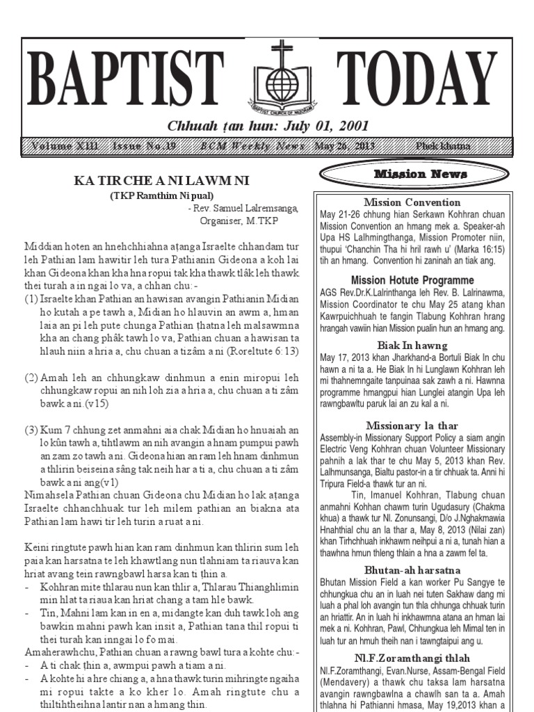 KMS. Dawngliana 9436371385 Executive Editor Rev. C.Lalbiakzama 9862241184 Chief Editor Rev. V. Vanlalchhunga Circulation Manager H.Lianchhngi 9436370532 Members Upa C.Hmingliana Upa V.Lalrinmawia Upa J.Lawmsanga Address: Baptist Today BCM Office Srkwn, Lunglei P.O.Zotlng- 796691 Mizoram A man Thla khatah ` 5/Kum khatah ` 60/-