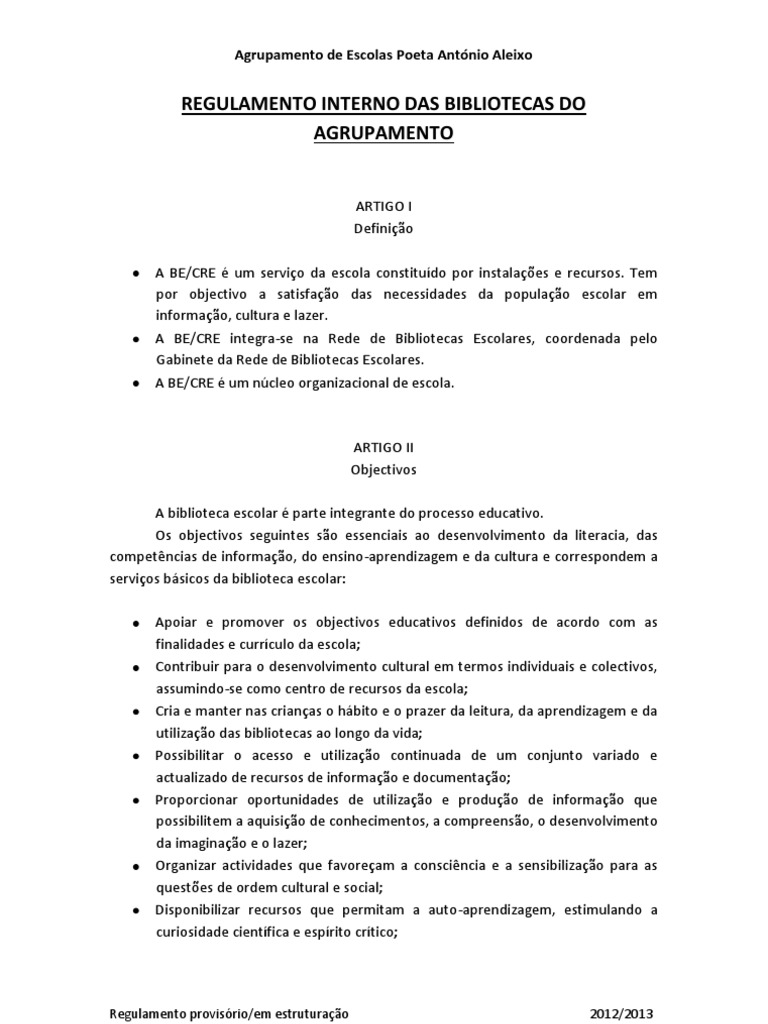 ARTIGO I Definio A BE/CRE um servio da escola constitudo por instalaes e recursos. Tem por objectivo a satisfao das necessidades da populao escolar em informao, cultura e lazer. A BE/CRE integra-se na Rede de Bibliotecas Escolares, coordenada pelo Gabinete da Rede de Bibliotecas Escolares. A BE/CRE um ncleo organizacional de escola.