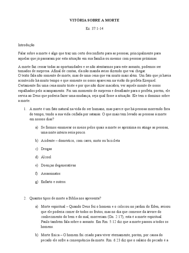 Introduo Falar sobre a morte algo que traz um certo desconforto para as pessoas, principalmente para aquelas que j passaram por esta situao em sua famlia ou mesmo com pessoas prximas. A morte faz cessar todas as oportunidades e se no atentarmos para este assunto, podemos ser tomados de surpresa. Afinal de contas, ela no manda aviso dizendo que vai chegar. O texto fala no somente de morte, mas de uma cena que vai muito mais alm. Um fato que j havia acontecido h muito tempo e que somente os ossos aparecem na viso do profeta Ezequiel. Certamente foi uma cena muito triste e por que no dizer macabra, ver aquele monte de ossos espalhados pelo acampamento. Foi um momento de surpresa e desafiante para o profeta, porm, ele servia ao Deus que poderia fazer uma mudana, seja qual fosse a situao. Ele tem o domnio sobre a morte. 1. A morte um fato natural na vida do ser humano, mas parece que h pessoas morrendo fora do tempo, tendo a sua vida ceifada por satans. O que mais tem levado as pessoas morte em nossos dias? a) Se formos enumerar os meios pelos quais a morte se aproxima ou atinge as pessoas, uma noite inteira seria pouco. b) Acidente domstico, com carro, moto ou bicicleta c) Drogas d) lcool e) Doenas degenerativas f) Assassinatos g) Enfarto e outros.