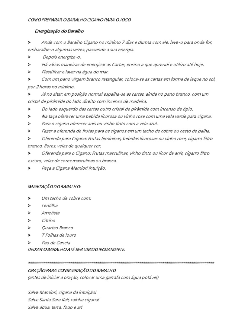 Ande com o Baralho Cigano no mnimo 7 dias e durma com ele, leve-o para onde for, Depois energize-o. H vrias maneiras de energizar as Cartas, ensino a que aprendi e utilizo at hoje. Plastificar e lavar na gua do mar. Com um pano virgem branco retangular, coloca-se as cartas em forma de leque no sol, J no altar, em posio normal espalha-se as cartas, ainda no pano branco, com um Do lado esquerdo das cartas outro cristal de pirmide com incenso de pio. Na taa oferecer uma bebida licorosa ou vinho rose com uma vela verde para cigana. Para o cigano oferecer anis ou vinho tinto com a vela azul. Fazer a oferenda de frutas para os ciganos em um tacho de cobre ou cesto de palha. Oferenda para Cigana: Frutas femininas, bebidas licorosas ou vinho rose, cigarro filtro Oferenda para o Cigano: Frutas masculinas, vinho tinto ou licor de anis, cigarro filtro Pea a Cigana Mamiori intuio.
