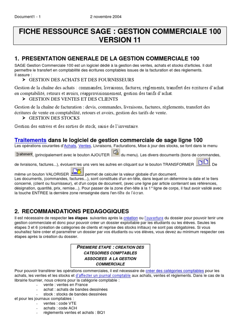 Il est ncessaire de respecter les tapes suivantes aprs la cration ou louverture du dossier pour pouvoir tenir une gestion commerciale et donc pour pouvoir crer un dossier exploitable par les tudiants ou les lves. Seules les tapes 3 et 6 (cration de catgories de clients et reprise des stocks initiaux) ne sont pas obligatoires. Si vous souhaitez faire crer et paramtrer un dossier par vos tudiants ou vos lves, vous devez au minimum respecter ces tapes aprs la cration du dossier.