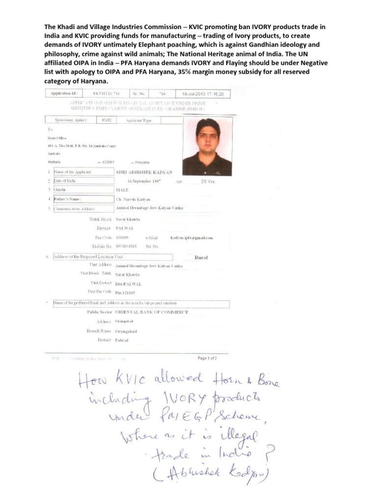 The Khadi and Village Industries Commission KVIC promoting ban IVORY products trade in India and KVIC providing funds for manufacturing trading of Ivory products, to create demands of IVORY untimately Elephant poaching, which is against Gandhian ideology and philosophy, crime against wild animals; The National Heritage animal of India. The UN affiliated OIPA in India PFA Haryana demands IVORY and Flaying should be under Negative list with apology to OIPA and PFA Haryana, 35% margin money subsidy for all reserved category of Haryana.