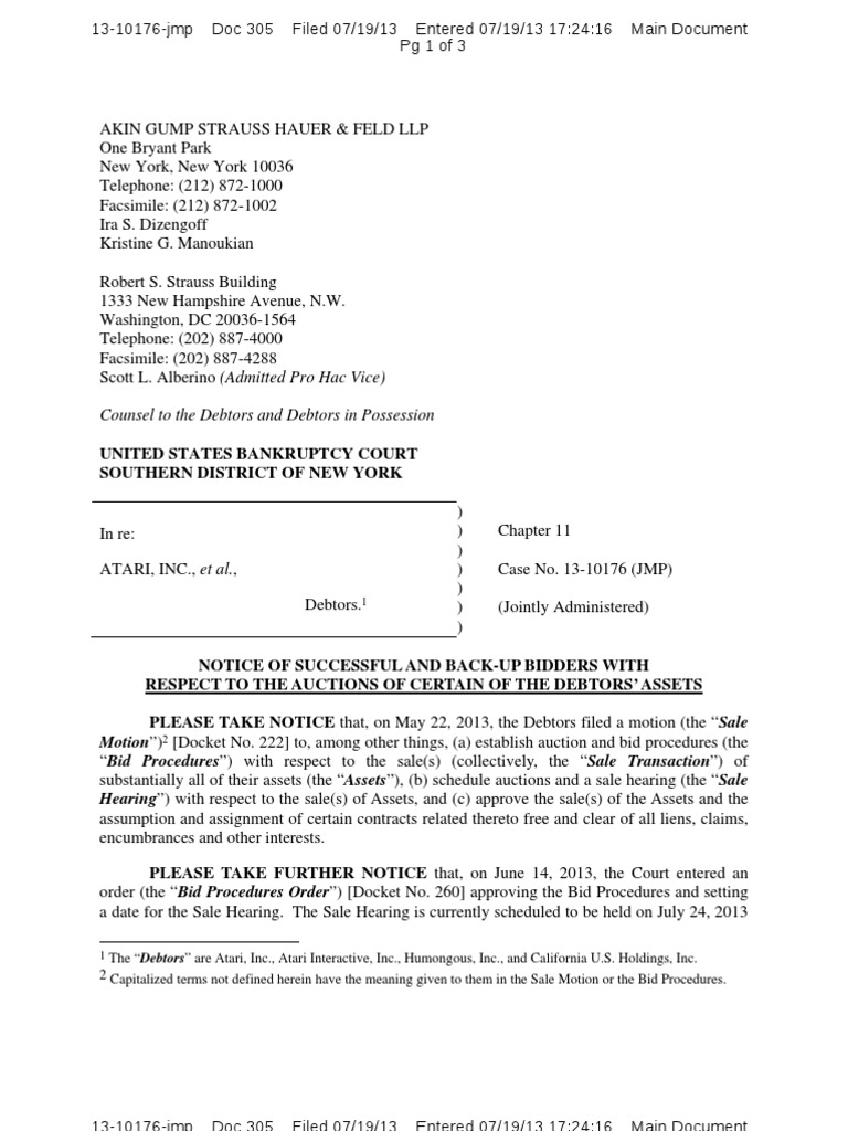 In re Atari, Inc. - NOTICE OF SUCCESSFUL AND BACK-UP BIDDERS WITH RESPECT TO THE AUCTIONS OF CERTAIN OF THE DEBTORS’ ASSETS126013701588