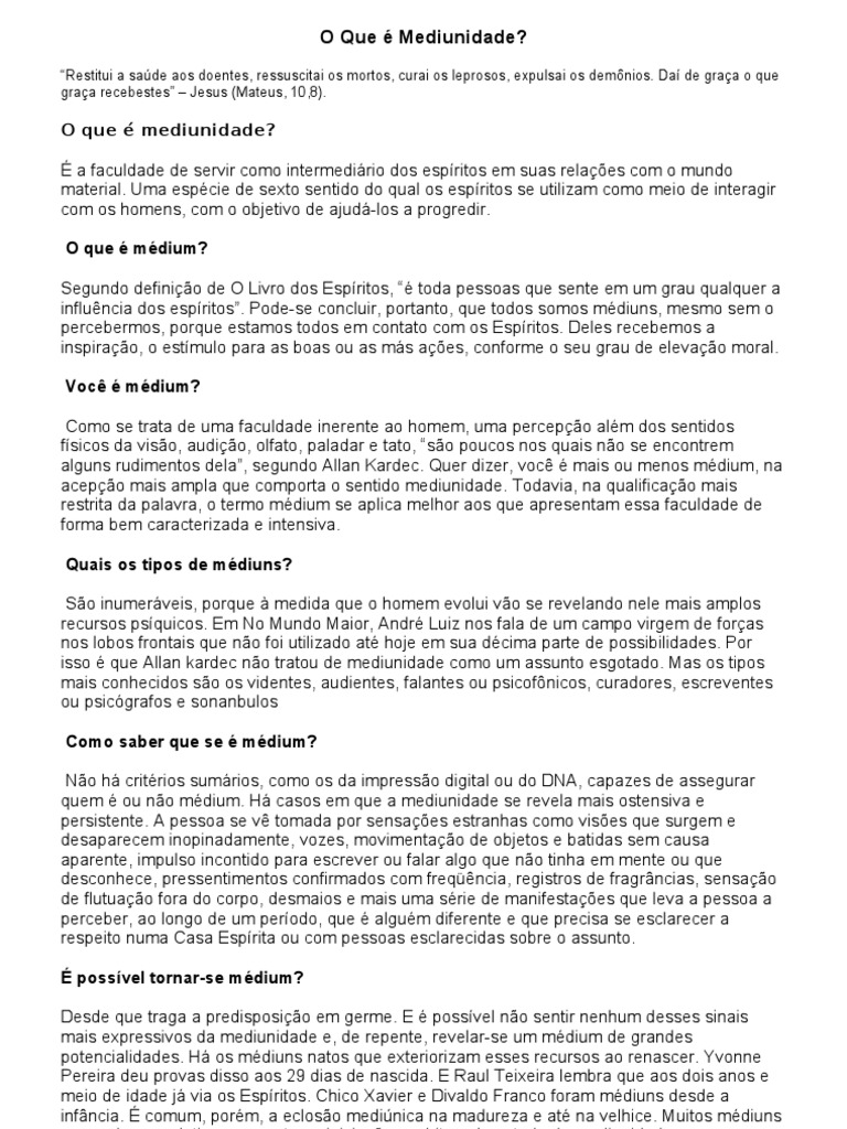 O que mediunidade? a faculdade de servir como intermedirio dos espritos em suas relaes com o mundo material. Uma espcie de sexto sentido do qual os espritos se utilizam como meio de interagir com os homens, com o objetivo de ajud-los a progredir. O que mdium? Segundo definio de O Livro dos Espritos, toda pessoas que sente em um grau qualquer a influncia dos espritos. Pode-se concluir, portanto, que todos somos mdiuns, mesmo sem o percebermos, porque estamos todos em contato com os Espritos. Deles recebemos a inspirao, o estmulo para as boas ou as ms aes, conforme o seu grau de elevao moral. Voc mdium? Como se trata de uma faculdade inerente ao homem, uma percepo alm dos sentidos fsicos da viso, audio, olfato, paladar e tato, so poucos nos quais no se encontrem alguns rudimentos dela, segundo Allan Kardec. Quer dizer, voc mais ou menos mdium, na acepo mais ampla que comporta o sentido mediunidade. Todavia, na qualificao mais restrita da palavra, o termo mdium se aplica melhor aos que apresentam essa faculdade de forma bem caracterizada e intensiva. Quais os tipos de mdiuns? So inumerveis, porque medida que o homem evolui vo se revelando nele mais amplos recursos psquicos. Em No Mundo Maior, Andr Luiz nos fala de um campo virgem de foras nos lobos frontais que no foi utilizado at hoje em sua dcima parte de possibilidades. Por isso que Allan kardec no tratou de mediunidade como um assunto esgotado. Mas os tipos mais conhecidos so os videntes, audientes, falantes ou psicofnicos, curadores, escreventes ou psicgrafos e sonanbulos Como saber que se mdium? No h critrios sumrios, como os da impresso digital ou do DNA, capazes de assegurar quem ou no mdium. H casos em que a mediunidade se revela mais ostensiva e persistente. A pessoa se v tomada por sensaes estranhas como vises que surgem e desaparecem inopinadamente, vozes, movimentao de objetos e batidas sem causa aparente, impulso incontido para escrever ou falar algo que no tinha em mente ou que desconhece, pressentimentos confirmados com freqncia, registros de fragrncias, sensao de flutuao fora do corpo, desmaios e mais uma srie de manifestaes que leva a pessoa a perceber, ao longo de um perodo, que algum diferente e que precisa se esclarecer a respeito numa Casa Esprita ou com pessoas esclarecidas sobre o assunto. possvel tornar-se mdium? Desde que traga a predisposio em germe. E possvel no sentir nenhum desses sinais mais expressivos da mediunidade e, de repente, revelar-se um mdium de grandes potencialidades. H os mdiuns natos que exteriorizam esses recursos ao renascer. Yvonne Pereira deu provas disso aos 29 dias de nascida. E Raul Teixeira lembra que aos dois anos e meio de idade j via os Espritos. Chico Xavier e Divaldo Franco foram mdiuns desde a infncia. comum, porm, a ecloso medinica na madureza e at na velhice. Muitos mdiuns se revelam produtivos somente na iniciao esprita pelo estudo da mediunidade.