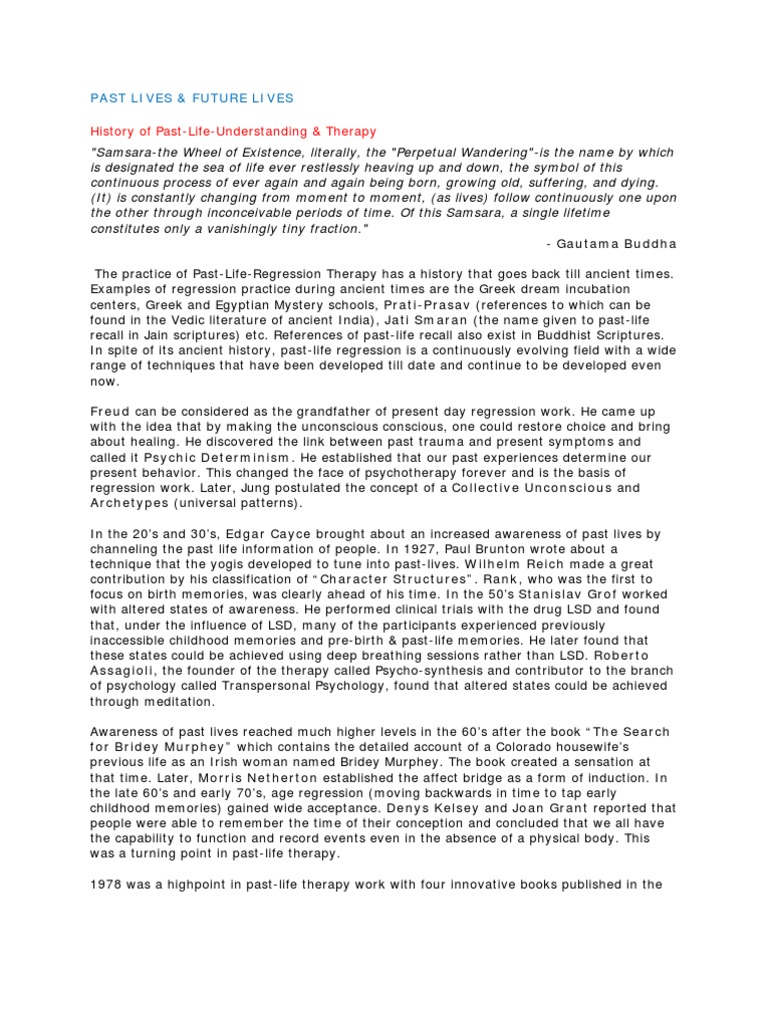 making them to journey into their past lives. By exploring our past lives we can find the solutions for all present life problems. Past-Life-Regression Therapy: Past-life-regression-therapy is a holistic therapy because it works on the body, mind, emotions, and spirit. It transports one back to those times before ones birth and regresses one to previous lifetimes. This is done to sort out problems that a person may be experiencing in the present. The reason for undertaking past-life-therapy is to improve the spiritual quality of our life, right now. Its chief objective is to make our life easier, better and more fulfilling, in this present moment. Past-life-regression therapy is a root cause therapy as it enables extremely deep change to take place at the very source of the problem. It does not deal with external symptoms. It directly addresses the internal cause. Cause and Effect: Past-life-regression-therapy is based on the principles of cause and effect (also known as law of karma). Something that has been set in motion at some time in the past results in a corresponding effect on a persons present physical, emotional, mental or spiritual well being, at this moment. This cause may be a past desire, a past thought, past feeling, a past emotion, a past vow, a past promise, a past decision, a past evasion or a past traumatic experience. Benefits of Past-Life-Regression: Past-Life-Regression helps to heal chronic diseases. This is done in the following manner: Past-Life-Regression helps individuals to understand the karmic patterns involved and the resultant energy blockages. It is these energy blockages that manifest as diseases, which are sometimes chronic. The understanding that flows clears the energy blockages and thereby the disease is healed. Take the example of a person who has had a past life wherein he/she was never allowed to express his/her views or who had to pay a heavy price for having expressed them. In this lifetime, such a person may have a disease of the throat, which constantly hinders the persons ability to talk normally. After reliving the past life and emerging with an understanding of the root cause, the energy blockages get cleared and the person gets healed of his/her throat disease. Past-Life-Regression helps overcome Fears and Phobias: Past-Life-Regression releases individuals from all kinds of fears and phobias by bringing about an understanding of the specific causes of these fears and phobias. The causes are mostly present in the previous lives. They could also be present in the earlier part of the current life. For example a person who had this fear of closed spaces (claustrophobia) had experienced a past life where he was buried alive in an earthquake. Once he relived this trauma, he was able to overcome his claustrophobia immediately. Past-Life-Regression improves ones inter-personal relationships: Past-LifeRegression improves ones interpersonal relationships by causing the person to understand the past life relationships with those individuals. Till this is understood, clashes and friction with ones present lifetimes relations is inevitable. Once the understanding flows, the person is able to see the larger perspective and therefore the relationships are improved or healed. Past-Life-Regression frees us from the fear of death once and for all: Past-LifeRegression frees us from the fear of death once and for all. The fear of death is the biggest of all fears plaguing mankind. Past-Life-Regression helps us to explore our past lives and through this exploration we realize that we are eternal beings. We understand that death is