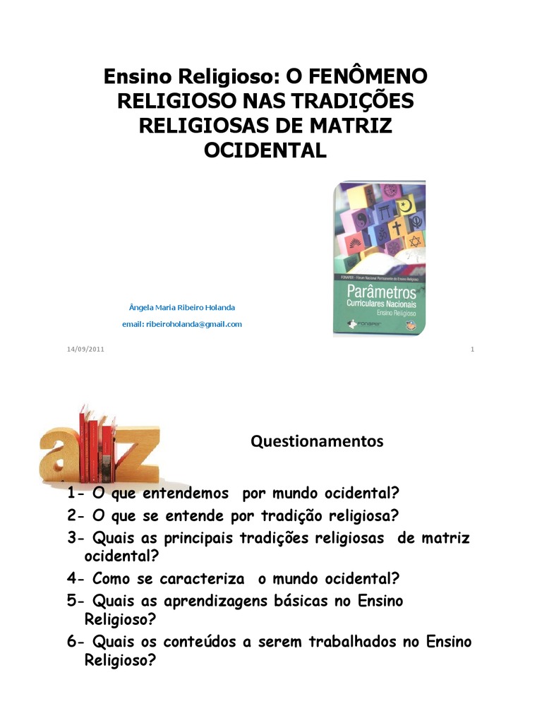 1- O que entendemos por mundo ocidental? 2- O que se entende por tradição religiosa? 3- Quais as principais tradições religiosas de matriz ocidental? 4- Como se caracteriza o mundo ocidental? 5- Quais as aprendizagens básicas no Ensino Religioso? 6- Quais os conteúdos a serem trabalhados no Ensino Religioso?