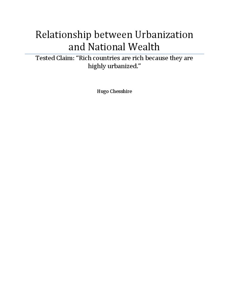 The statement proposes a causal relationship: urbanization is a cause (or the cause) of wealth. It does not imply mere correlation alone rich countries are also highly urbanized but that urbanization leads to or creates wealth in some way. To test this, however, the first step would be to establish that there is a correlation between a countrys wealth and its level of urbanization. The correlation alone does not prove causation, but without a correlation, a causal link could not exist. Defining and examining urbanization is relatively easy; while there are some grey areas around the point at which a rural village might grow sufficiently to become classified as a town or an urban area, the comparison of urban with rural areas is quite well-established in the field. Wealth is a little more problematic. It is often understood in strictly monetary terms, but we can also understand a countrys wealth in terms of things such as mineral wealth or oil reserves, or perhaps even in scientific or cultural output. However, for the purposes of this study, the standard definition of wealth in economic productivity as expressed in monetary terms will suffice. This is not only internationally agreed-upon and data-rich, but is also an expression of wealth much more likely to be tied to urbanization than other definitions, and more likely to produce useful data. The question to be answered, then, becomes whether there is a positive correlation between per-capita gross domestic product (GDP) (as we ought to control for the effect of population size on overall national wealth) and the urban population as a proportion of national population. If a correlation exists, then a possible causal mechanism can be investigated. It is important to understand whether urbanization is a cause of wealth, since many countries might actively pursue urbanization if they believed it caused national wealth. A major factor in the collapse of the Soviet Union was excessive urbanization and a national de-emphasis on agricultural productivity; the centralized bureaucracy became obsessed with urbanization and industrial output, leading to its neglect of the rural Soviet Union and agricultural output which 1