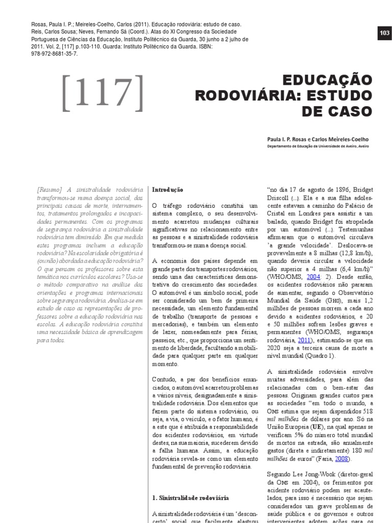 Reis, Carlos Sousa; Neves, Fernando Sá (Coord.). Atas do XI Congresso da Sociedade Portuguesa de Ciências da Educação, Instituto Politécnico da Guarda, 30 junho a 2 julho de 2011. Vol. 2, [117] p.103-110. Guarda: Instituto Politécnico da Guarda. ISBN: 978-972-8681-35-7.