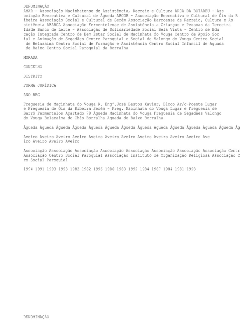 DENOMINAO MORADA CONCELHO DISTRITO FORMA JURDICA ANO REG Centro Social Paroquial da Moita da Anadia Centro Social Recreativo e Cultural d e Pedralva Moita - Anadia Lugar de Pedralva, Freguesia de S.Loureno Bairro Anadia Anadia Anadia Anadia Anadia Anadia Anadia Arouca Arouca Arouca Arouca Aro uca Arouca Arouca Arouca Aveiro Aveiro Aveiro Aveiro Aveiro Aveiro Aveiro Aveiro Aveiro Aveiro Aveiro Ave iro Aveiro Aveiro Aveiro