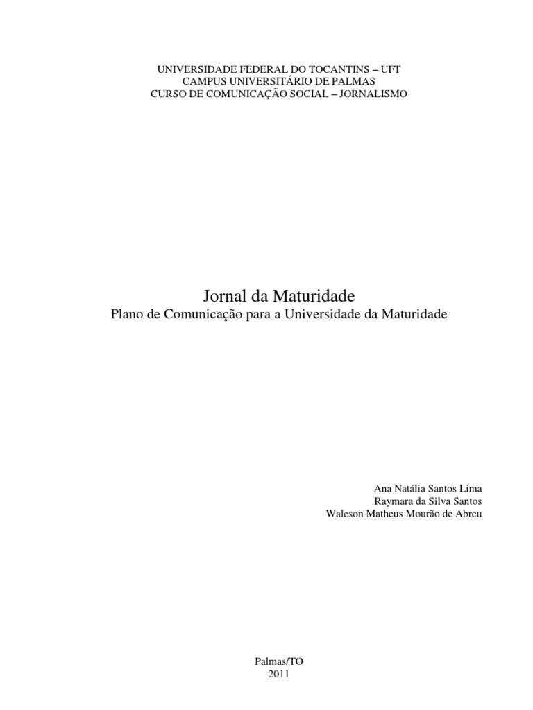 A partir do contato com os acadmicos da UMA, conclumos que o veculo de comunicao mais adequado para eles seria o impresso. O Jornal da Maturidade a publicao principal vinculada a este projeto. O informativo uma publicao diagramada no software InDesign e impressa em papel A3 para distribuio nos polos da UMA Universidade da Maturidade e se prope a divulgar em meio impresso, de formato A4, com periodicidade bimestral, um informativo de divulgao das aes da UMA, bem como demais assuntos de diversas reas de interesse deste pblico, tais como: direito previdencirio, sade, transportes, assistncia social, habitao, entre outras. A edio do Jornal da Maturidade possui: 8 pginas tamanho A4 orientadas em retrato; fonte 12 para melhor leitura do pblico alvo, que composto por pessoas da terceira idade; cores nas pginas 1 e 8 e na seo de fotos, nas pginas 4 e 5. A respeito do contedo, composto por textos divididos em editorias como: sade, educao, vida ativa e turismo, alm da seo Aes da UMA que contm fotos e textos sobre eventos relacionados pela Universidade da Maturidade. Na editoria de sade, abordamos o AVC Acidente Vascular Cerebral em idoso. Em educao, o analfabetismo entre idosos em Palmas. Na editoria Vida Ativa, tratamos sobre exerccios fsicos mais indicados para idosos. Em turismo, foram apresentadas as facilidades que as empresas de turismo oferecem para a terceira idade. O informativo possui tambm um editorial que apresenta o objetivo que queremos alcanar com a publicao, alm de um artigo assinado pela Coordenadora da UMA, Dra. Neila Barbosa Osrio, uma seo onde parabenizamos os aniversariantes do ms de maio e junho, bem como o Entre Aspas, que possui relatos de acadmicos a repeito do que mudou em suas vidas aps o ingresso na UMA. A circulao interna viabilizar a integrao do grupo aos demais grupos da universidade, enquanto a circulao externa, direcionada s demais instituies que trabalham com o mesmo pblico alvo, e proporcionar a criao de parcerias e o aumento da clientela. Atravs do Jornal da Maturidade objetiva-se fortalecer a imagem da UMA junto aos pblicos interno e externo, mantendo-os sempre informados das aes deste grupo.