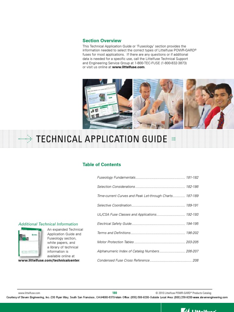 This Technical Application Guide or ‘Fuseology’ section provides the information needed to select the correct types of Littelfuse POWR-GARD® fuses for most applications. If there are any questions or if additional data is needed for a specific use, call the Littelfuse Technical Support and Engineering Service Group at 1-800-TEC-FUSE (1-800-832-3873) or visit us online at www.littelfuse.com.