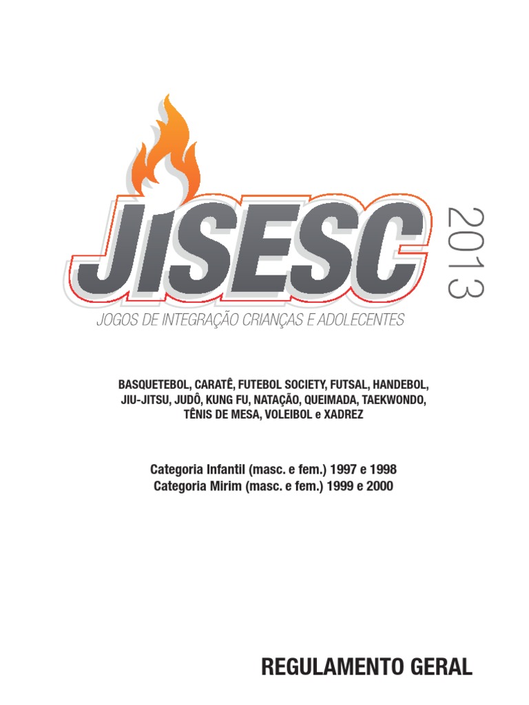 Das Disposies Preliminares Art. 1. Os Jogos de Integrao Crianas e Adolescentes do Sesc-DF JISESC/2013 so promovidos pelo Servio Social do Comrcio Sesc-DF e executados pelas unidades operacionais. Os jogos so regidos pelo presente Regulamento Geral, pelo Regulamento Especfico de cada modalidade e por decises da Comisso Organizadora, publicadas em boletins e notas oficiais.