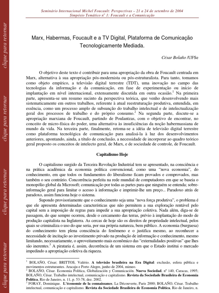O objetivo deste texto contribuir para uma apropriao da obra de Foucault centrada em Marx, alternativa sua apropriao ps-modernista ou ps-estruturalista. Para tanto, tomamos como objeto emprico, a televiso digital terrestre (TDT), uma inovao no campo das tecnologias da informao e da comunicao, em fase de experimentao ou incio de implantao em nvel internacional, extensamente discutida em outra ocasio.1 Na primeira parte, apresenta-se um resumo sucinto da perspectiva terica, que venho desenvolvendo mais sistematicamente em outros trabalhos, referente atual reestruturao produtiva, entendida, em essncia, como um processo amplo de subsuno do trabalho intelectual e de intelectualizao geral dos processos de trabalho e do prprio consumo.2 Na segunda parte, discute-se a apropriao marxiana de Foucault, partindo de Poulantzas, com o objetivo de encontrar, no conceito de micro-fsica do poder, uma alternativa s insuficincias da noo habermassiana de mundo da vida. Na terceira parte, finalmente, retoma-se a idia de televiso digital terrestre como plataforma tecnolgica de comunicao para analis-la luz dos desenvolvimentos anteriores, apontando, ainda, a ttulo de concluso, a necessidade de incorporar ao quadro terico geral proposto os conceitos de intelecto geral, de Marx, e de sociedade de controle, de Foucault. Capitalismo Hoje O capitalismo surgido da Terceira Revoluo Industrial tem se apresentado, na conscincia e na prtica acadmica da economia poltica convencional, como uma nova economia, do conhecimento, em que todos os fundamentos do liberalismo ficam provados e comprovados, mas tambm o seu contrrio. Concorrncia perfeita na rede mundial de computadores em que se baseia o monoplio global da Microsoft; comunicao por todas as partes para que ningum se entenda; sobreinformao geral para limitar o acesso informao e imprimir-lhe um preo... Paradoxo atrs de paradoxo, assim funciona hoje o sistema. Supondo provisoriamente que o conhecimento seja uma nova fora produtiva, o problema que ele apresenta determinadas caractersticas que no permitem a sua explorao rentvel pelo capital sem a imposio de regras para impedir a sua apropriao coletiva. Nada alm, diga-se de passagem, do que sempre ocorreu, desde o cercamento das terras, prvio implantao do modo de produo capitalista na Inglaterra. As cercas de hoje so os direitos de propriedade intelectual, pelos quais se criminaliza o uso do que seria, por sua prpria natureza, bem pblico. A economia (burguesa) do conhecimento tem plena conscincia do fenmeno e o justifica mesmo, ao reconhecer a necessidade de incitao ao investimento privado na produo de informao e conhecimento, mesmo limitando, necessariamente, o aproveitamento mais econmico das externalidades positivas que lhes so inerentes.3 A pirataria , assim, decorrncia de um sistema em que o Estado institui o mercado impedindo a apropriao coletiva da riqueza.