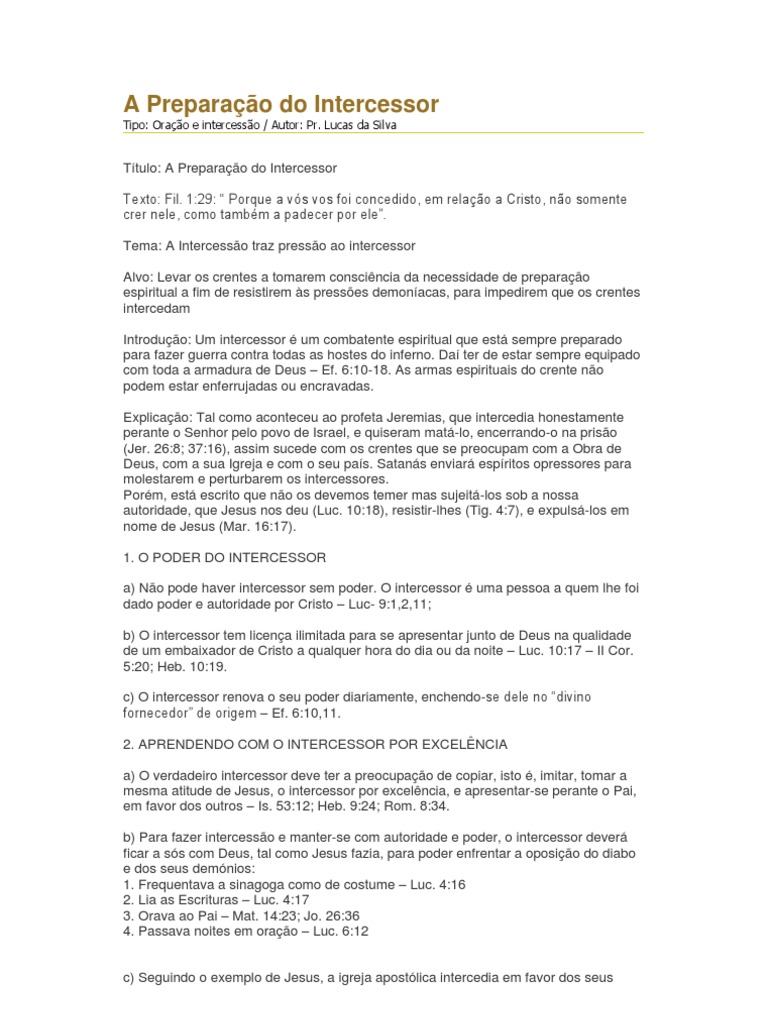 Ttulo: A Preparao do Intercessor Texto: Fil. 1:29: Porque a vs vos foi concedido, em relao a Cristo, no somente crer nele, como tambm a padecer por ele. Tema: A Intercesso traz presso ao intercessor Alvo: Levar os crentes a tomarem conscincia da necessidade de preparao espiritual a fim de resistirem s presses demonacas, para impedirem que os crentes intercedam Introduo: Um intercessor um combatente espiritual que est sempre preparado para fazer guerra contra todas as hostes do inferno. Da ter de estar sempre equipado com toda a armadura de Deus Ef. 6:10-18. As armas espirituais do crente no podem estar enferrujadas ou encravadas. Explicao: Tal como aconteceu ao profeta Jeremias, que intercedia honestamente perante o Senhor pelo povo de Israel, e quiseram mat-lo, encerrando-o na priso (Jer. 26:8; 37:16), assim sucede com os crentes que se preocupam com a Obra de Deus, com a sua Igreja e com o seu pas. Satans enviar espritos opressores para molestarem e perturbarem os intercessores. Porm, est escrito que no os devemos temer mas sujeit-los sob a nossa autoridade, que Jesus nos deu (Luc. 10:18), resistir-lhes (Tig. 4:7), e expuls-los em nome de Jesus (Mar. 16:17). 1. O PODER DO INTERCESSOR a) No pode haver intercessor sem poder. O intercessor uma pessoa a quem lhe foi dado poder e autoridade por Cristo Luc- 9:1,2,11; b) O intercessor tem licena ilimitada para se apresentar junto de Deus na qualidade de um embaixador de Cristo a qualquer hora do dia ou da noite Luc. 10:17 II Cor. 5:20; Heb. 10:19. c) O intercessor renova o seu poder diariamente, enchendo-se dele no divino fornecedor de origem Ef. 6:10,11. 2. APRENDENDO COM O INTERCESSOR POR EXCELNCIA a) O verdadeiro intercessor deve ter a preocupao de copiar, isto , imitar, tomar a mesma atitude de Jesus, o intercessor por excelncia, e apresentar-se perante o Pai, em favor dos outros Is. 53:12; Heb. 9:24; Rom. 8:34. b) Para fazer intercesso e manter-se com autoridade e poder, o intercessor dever ficar a ss com Deus, tal como Jesus fazia, para poder enfrentar a oposio do diabo e dos seus demnios: 1. Frequentava a sinagoga como de costume Luc. 4:16 2. Lia as Escrituras Luc. 4:17 3. Orava ao Pai Mat. 14:23; Jo. 26:36 4. Passava noites em orao Luc. 6:12