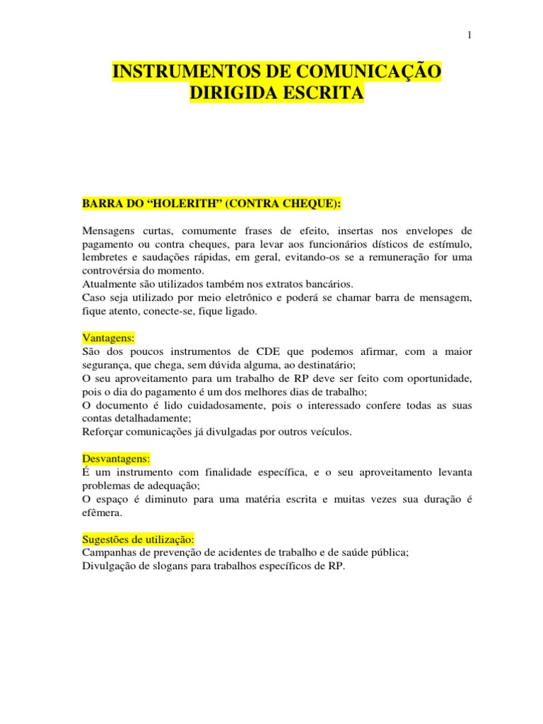 BARRA DO HOLERITH (CONTRA CHEQUE): Mensagens curtas, comumente frases de efeito, insertas nos envelopes de pagamento ou contra cheques, para levar aos funcionrios dsticos de estmulo, lembretes e saudaes rpidas, em geral, evitando-os se a remunerao for uma controvrsia do momento. Atualmente so utilizados tambm nos extratos bancrios. Caso seja utilizado por meio eletrnico e poder se chamar barra de mensagem, fique atento, conecte-se, fique ligado. Vantagens: So dos poucos instrumentos de CDE que podemos afirmar, com a maior segurana, que chega, sem dvida alguma, ao destinatrio; O seu aproveitamento para um trabalho de RP deve ser feito com oportunidade, pois o dia do pagamento um dos melhores dias de trabalho; O documento lido cuidadosamente, pois o interessado confere todas as suas contas detalhadamente; Reforar comunicaes j divulgadas por outros veculos. Desvantagens: um instrumento com finalidade especfica, e o seu aproveitamento levanta problemas de adequao; O espao diminuto para uma matria escrita e muitas vezes sua durao efmera. Sugestes de utilizao: Campanhas de preveno de acidentes de trabalho e de sade pblica; Divulgao de slogans para trabalhos especficos de RP.