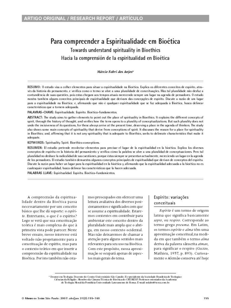 A compreenso da espiritualidade dentro da Biotica passa necessariamente por um conceito bsico que lhe d suporte: o esprito. Entretanto, o que o esprito? Logo se ver que sua conceituao terica mais complexa do que primeira vista pode parecer. Neste breve ensaio, nosso interesse est voltado no propriamente para a conceituao de esprito, mas para o contexto terico em que inserir a compreenso da espiritualidade na Biotica. Por isto tambm no esta-