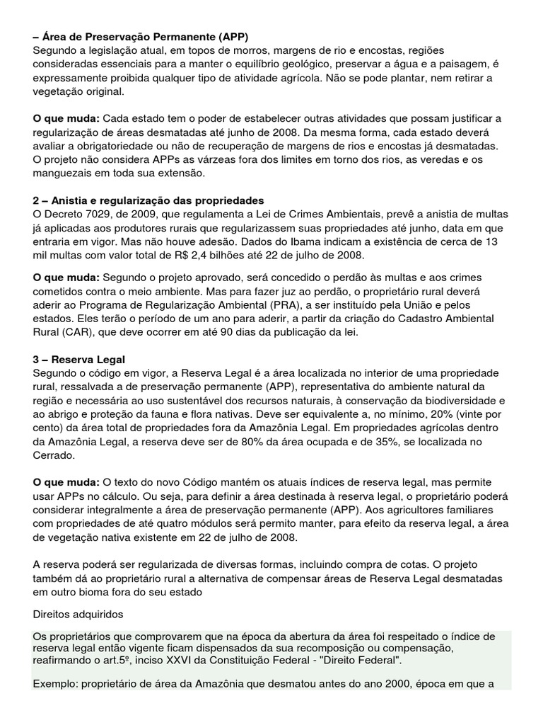 para a manter o equilbrio geolgico, preservar a gua e a paisagem, expressamente proibida qualquer tipo de atividade agrcola. No se pode plantar, nem retirar a vegetao original. O que muda: Cada estado tem o poder de estabelecer outras atividades que possam justificar a regularizao de reas desmatadas at junho de 2008. Da mesma forma, cada estado dever avaliar a obrigatoriedade ou no de recuperao de margens de rios e encostas j desmatadas. O projeto no considera APPs as vrzeas fora dos limites em torno dos rios, as veredas e os manguezais em toda sua extenso. 2 Anistia e regularizao das propriedades O Decreto 7029, de 2009, que regulamenta a Lei de Crimes Ambientais, prev a anistia de multas j aplicadas aos produtores rurais que regularizassem suas propriedades at junho, data em que entraria em vigor. Mas no houve adeso. Dados do Ibama indicam a existncia de cerca de 13 mil multas com valor total de R$ 2,4 bilhes at 22 de julho de 2008. O que muda: Segundo o projeto aprovado, ser concedido o perdo s multas e aos crimes cometidos contra o meio ambiente. Mas para fazer juz ao perdo, o proprietrio rural dever aderir ao Programa de Regularizao Ambiental (PRA), a ser institudo pela Unio e pelos estados. Eles tero o perodo de um ano para aderir, a partir da criao do Cadastro Ambiental Rural (CAR), que deve ocorrer em at 90 dias da publicao da lei. 3 Reserva Legal Segundo o cdigo em vigor, a Reserva Legal a rea localizada no interior de uma propriedade rural, ressalvada a de preservao permanente (APP), representativa do ambiente natural da regio e necessria ao uso sustentvel dos recursos naturais, conservao da biodiversidade e ao abrigo e proteo da fauna e flora nativas. Deve ser equivalente a, no mnimo, 20% (vinte por cento) da rea total de propriedades fora da Amaznia Legal. Em propriedades agrcolas dentro da Amaznia Legal, a reserva deve ser de 80% da rea ocupada e de 35%, se localizada no Cerrado. O que muda: O texto do novo Cdigo mantm os atuais ndices de reserva legal, mas permite usar APPs no clculo. Ou seja, para definir a rea destinada reserva legal, o proprietrio poder considerar integralmente a rea de preservao permanente (APP). Aos agricultores familiares com propriedades de at quatro mdulos ser permito manter, para efeito da reserva legal, a rea de vegetao nativa existente em 22 de julho de 2008. A reserva poder ser regularizada de diversas formas, incluindo compra de cotas. O projeto tambm d ao proprietrio rural a alternativa de compensar reas de Reserva Legal desmatadas em outro bioma fora do seu estado Direitos adquiridos Os proprietrios que comprovarem que na poca da abertura da rea foi respeitado o ndice de reserva legal ento vigente ficam dispensados da sua recomposio ou compensao, reafirmando o art.5, inciso XXVI da Constituio Federal - "Direito Federal". Exemplo: proprietrio de rea da Amaznia que desmatou antes do ano 2000, poca em que a