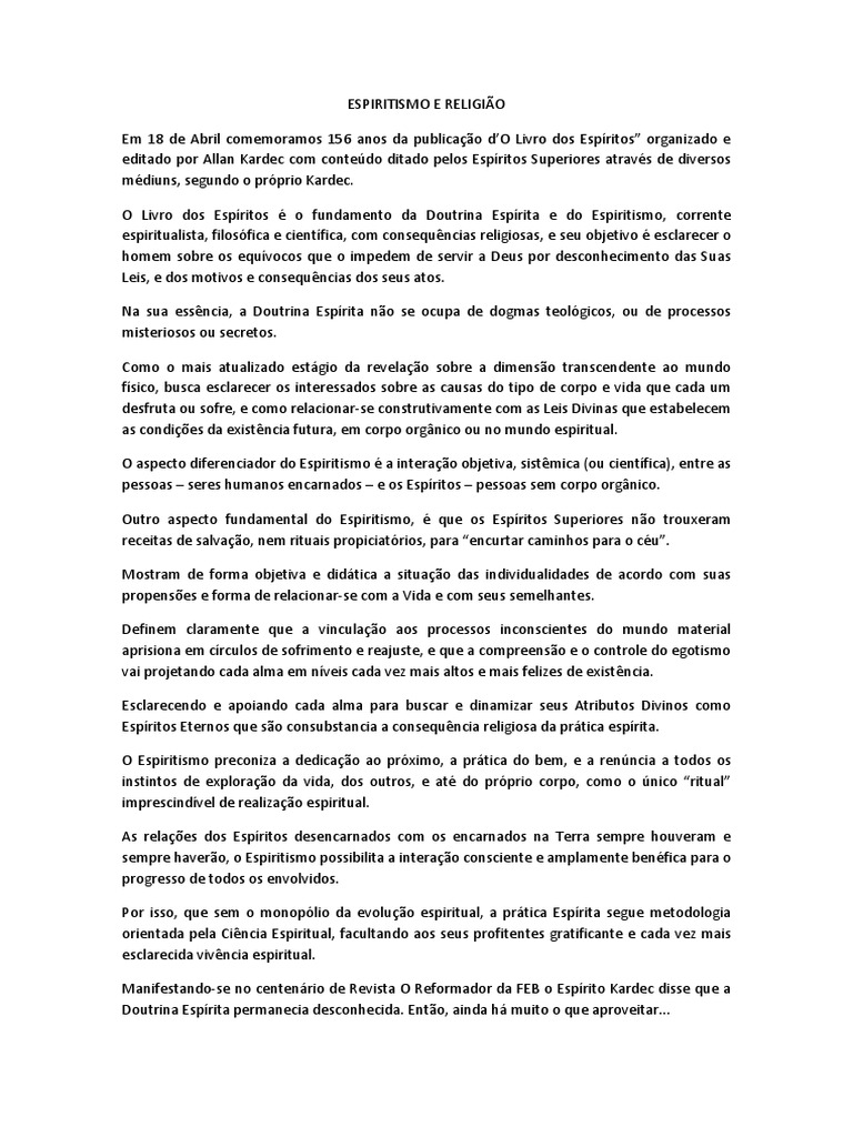 com contedo ditado pelos Espritos Superiores atravs de diversos mdiuns, segundo o prprio Kardec. O Livro dos Espritos o fundamento da Doutrina Esprita e do Espiritismo, corrente espiritualista, filosfica e cientfica, com consequncias religiosas, e seu objetivo esclarecer o homem sobre os equvocos que o impedem de servir a Deus por desconhecimento das Suas Leis, e dos motivos e consequncias dos seus atos. Na sua essncia, a Doutrina Esprita no se ocupa de dogmas teolgicos, ou de processos misteriosos ou secretos. Como o mais atualizado estgio da revelao sobre a dimenso transcendente ao mundo fsico, busca esclarecer os interessados sobre as causas do tipo de corpo e vida que cada um desfruta ou sofre, e como relacionar-se construtivamente com as Leis Divinas que estabelecem as condies da existncia futura, em corpo orgnico ou no mundo espiritual. O aspecto diferenciador do Espiritismo a interao objetiva, sistmica (ou cientfica), entre as pessoas seres humanos encarnados e os Espritos pessoas sem corpo orgnico. Outro aspecto fundamental do Espiritismo, que os Espritos Superiores no trouxeram receitas de salvao, nem rituais propiciatrios, para encurtar caminhos para o cu. Mostram de forma objetiva e didtica a situao das individualidades de acordo com suas propenses e forma de relacionar-se com a Vida e com seus semelhantes. Definem claramente que a vinculao aos processos inconscientes do mundo material aprisiona em crculos de sofrimento e reajuste, e que a compreenso e o controle do egotismo vai projetando cada alma em nveis cada vez mais altos e mais felizes de existncia. Esclarecendo e apoiando cada alma para buscar e dinamizar seus Atributos Divinos como Espritos Eternos que so consubstancia a consequncia religiosa da prtica esprita. O Espiritismo preconiza a dedicao ao prximo, a prtica do bem, e a renncia a todos os instintos de explorao da vida, dos outros, e at do prprio corpo, como o nico ritual imprescindvel de realizao espiritual. As relaes dos Espritos desencarnados com os encarnados na Terra sempre houveram e sempre havero, o Espiritismo possibilita a interao consciente e amplamente benfica para o progresso de todos os envolvidos. Por isso, que sem o monoplio da evoluo espiritual, a prtica Esprita segue metodologia orientada pela Cincia Espiritual, facultando aos seus profitentes gratificante e cada vez mais esclarecida vivncia espiritual. Manifestando-se no centenrio de Revista O Reformador da FEB o Esprito Kardec disse que a Doutrina Esprita permanecia desconhecida. Ento, ainda h muito o que aproveitar...
