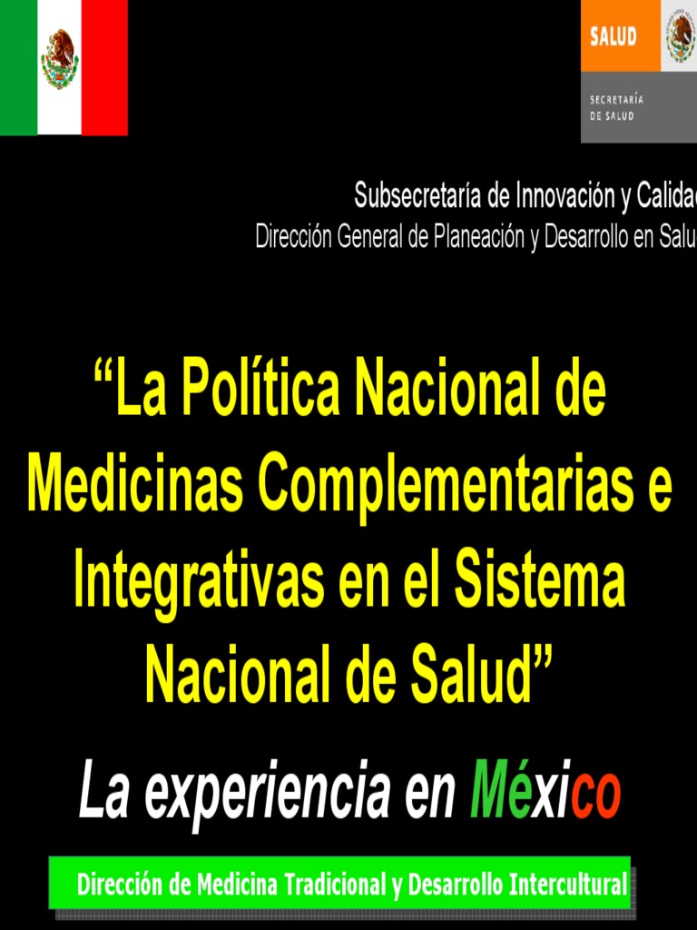 Medicina Tradicional 3.Subsecretaría de Innovación y Calidad Dirección General de Planeación y Desarrollo en Salud Dirección de Medicina Tradicional y Desarrollo Intercultural La Política intercultural consta de los siguientes programas: 1. Política de Atención a la Salud de los Pueblos Indígenas . Enfoque Intercultural en los servicios de salud: 2. Sistemas Complementarios 4.