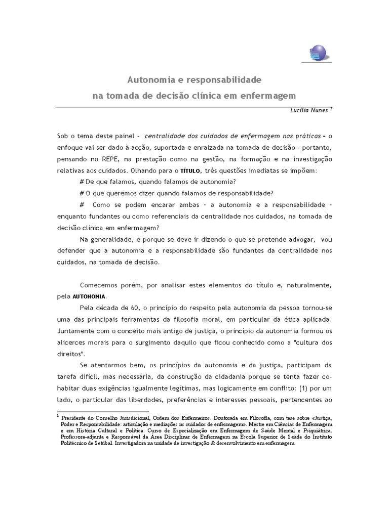 Sob o tema deste painel - centralidade dos cuidados de enfermagem nas prticas - o enfoque vai ser dado aco, suportada e enraizada na tomada de deciso - portanto, pensando no REPE, na prestao como na gesto, na formao e na investigao relativas aos cuidados. Olhando para o TTULO, trs questes imediatas se impem: # De que falamos, quando falamos de autonomia? # O que queremos dizer quando falamos de responsabilidade? # Como se podem encarar ambas a autonomia e a responsabilidade enquanto fundantes ou como referenciais da centralidade nos cuidados, na tomada de deciso clnica em enfermagem? Na generalidade, e porque se deve ir dizendo o que se pretende advogar, vou defender que a autonomia e a responsabilidade so fundantes da centralidade nos cuidados, na tomada de deciso. Comecemos porm, por analisar estes elementos do ttulo e, naturalmente, pela AUTONOMIA. Pela dcada de 60, o princpio do respeito pela autonomia da pessoa tornou-se uma das principais ferramentas da filosofia moral, em particular da tica aplicada. Juntamente com o conceito mais antigo de justia, o princpio da autonomia formou os alicerces morais para o surgimento daquilo que ficou conhecido como a "cultura dos direitos". Se atentarmos bem, os princpios da autonomia e da justia, participam da tarefa difcil, mas necessria, da construo da cidadania porque se tenta fazer cohabitar duas exigncias igualmente legtimas, mas logicamente em conflito: (1) por um lado, o particular das liberdades, preferncias e interesses pessoais, pertencentes ao