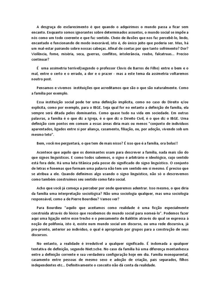 . Enquanto somos ignorantes sobre determinados assuntos, o mundo social se impe a ns como um todo coerente e que faz sentido. Cheio de iluses que nos faz perceb-lo, lindo, encantado e funcionando de modo inexorvel, isto , do nico jeito que poderia ser. Mas, h um mal-estar pairando sobre nossas cabeas. Afinal de contas por que tanto sofrimento? Dor? Violncia, fome, misria, seca, guerras, conflitos, intolerncia, roubo, falcatruas... Preciso continuar? uma assimetria terrvel(segundo o professor Clovis de Barros de Filho) entre o bem e o mal, entre o certo e o errado, a dor e o prazer - mas a este tema da assimetria voltaremos noutro post. Pensamos e vivemos instituies que acreditamos que so o que so naturalmente. Como a famlia por exemplo. Essa instituio social pode ter uma definio implcita, como no caso do Direito e/ou explicita, como por exemplo, para o IBGE. Seja qual for no entanto a definio de famlia, ela sempre ser ditada pelos dominantes. Como quase tudo na vida em sociedade. Em outras palavras, a famlia o que diz a Igreja, o que diz o Direito Civil, o que diz o IBGE. Uma definio com pontos em comum a essas reas diria mais ou menos "conjunto de indivduos aparentados, ligados entre si por aliana, casamento, filiao, ou, por adoo, vivendo sob um mesmo teto". Bem, voc me perguntar, o que tem de mais nisso? isso que a famlia, ora bolas!! Acontece que aquilo que os dominantes usam para descrever a famlia, nada mais so do que signos lingusticos. E como todos sabemos, o signo arbitrrio e ideolgico, cujo sentido est fora dele. H uma luta titnica pela posse do significado do signo lingustico. O conjunto de letras e fonemas que formam uma palavra no tem um sentido em si mesmo. preciso que se atribua a ele. Quando definimos algo usando o signo lingustico, no s o descrevemos como tambm construmos seu sentido como fato social. Acho que voc j comea a perceber por onde queremos adentrar. Isso mesmo, o que diria da famlia uma interpretao sociolgica? No uma sociologia qualquer, mas uma sociologia responsvel, como a de Pierre Bourdieu? Vamos ver? Para Bourdieu "aquilo que aceitamos como realidade uma fico especialmente construda atravs do lxico que recebemos do mundo social para nome-lo". Podemos fazer aqui uma ligao entre esse trecho e o pensamento de Bakhtin atravs do qual se expressa noo de polifonia, isto , existe num mundo social um discurso, ou uma rede discursiva, j pre-pronto, anterior ao indivduo, o qual apropriado por grupos para a construo de seus discursos. No entanto, a realidade irredutvel a qualquer significado. indomada a qualquer tentativa de definio, segundo Nietzsche. No caso da famlia h uma diferena montanhesca entre a definio corrente e sua verdadeira configurao hoje em dia. Famlia monoparental, casamento entre pessoas de mesmo sexo e adoo de criao, pais separados, filhos independentes etc... Definitivamente o conceito no d conta da realidade.