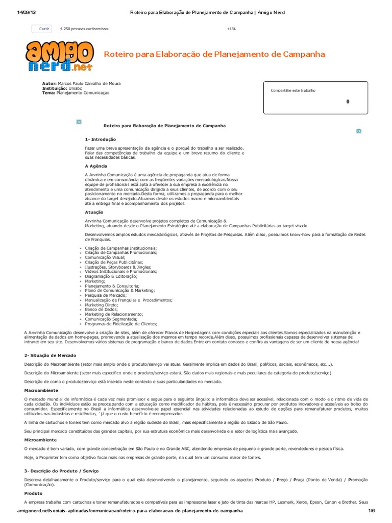 Roteiro para Elaborao de Planejamento de Campanha 1- Introduo Fazer uma breve apresentao da agncia e o porqu do trabalho a ser realizado. Falar das competncias da trabalho da equipe e um breve resumo do cliente e suas necessidades bsicas. A Agncia A Arvrinha Comunicao uma agncia de propaganda que atua de forma dinmica e em consonncia com as freqentes variaes mercadolgicas.Nossa equipe de profissionais est apta a oferecer a sua empresa a excelncia no atendimento e uma comunicao dirigida a seus clientes, de acordo com o seu posicionamento no mercado.Desta forma, utilizamos a propaganda para o melhor alcance do target desejado.Atuamos desde os estudos macro e microambientais at a entrega final e acompanhamento dos projetos. Atuao Arvrinha Comunicao desenvolve projetos completos de Comunicao & Marketing, atuando desde o Planejamento Estratgico at a elaborao de Campanhas Publicitrias ao target visado. Desenvolvemos amplos estudos mercadolgicos, atravs de Projetos de Pesquisas. Alm disso, possuimos know-how para a formatao de Redes de Franquias. Criao de Campanhas Institucionais; Criao de Campanhas Promocionais; Comunicao Visual; Criao de Peas Publicitrias; Ilustraes, Storyboards & Jingles; Vdeos Institucionais e Promocionais; Diagramao & Editorao; Marketing; Planejamento & Consultoria; Plano de Comunicao & Marketing; Pesquisa de Mercado; Manualizao de Franquias e Procedimentos; Marketing Direto; Banco de Dados; Marketing de Relacionamento; Comunicao Segmentada; Programas de Fidelizao de Clientes; A Arvrinha Comunicao desenvolve a criao de sites, alm de oferecer Planos de Hospedagens com condies especiais aos clientes.Somos especializados na manuteno e alimentao de dados em home-pages, promovendo a atualizao dos mesmos em tempo recorde.Alm disso, possuimos profissionais capazes de desenvolver sistemas de intranet em seu site. Desenvolvemos vrios sistemas de programao e banco de dados.Entre em contato conosco e confira as vantagens de ser um cliente de nossa agncia! 2- Situao de Mercado Descrio do Macroambiente (setor mais amplo onde o produto/servio vai atuar. Geralmente implica em dados do Brasil, polticos, sociais, econmicos, etc...). Descrio do Microambiente (setor mais especfico onde o produto/servio estar. So dados mais regionais e mais peculiares da categoria do produto/servio). Descrio de como o produto/servio est inserido neste contexto e suas particularidades no mercado. Macroambiente O mercado mundial de informtica cada vez mais promissor e segue para o seguinte ngulo: a informtica deve ser acessvel, relacionada com o modo e o ritmo de vida de cada cidado. Os indivduos esto se preocu pando com a educao como modificador de hbitos, pois necessrio procurar por produtos inovadores e acessveis ao bolso do consumidor. Especificamente no Brasil a informtica desenvolve-se papel essencial nas atividades relacionadas ao estudo de opes para remanufaturar produtos, muitos utilizados nas industrias e residncias, j que o custo benefcio recompensador. A linha de cartuchos e toners tem como mercado alvo a regio sudeste do Brasil, mais especificamente a regio do Estado de So Paulo. Seu principal mercado constitudos das grandes capitais, por sua estrutura econmica mais desenvolvida e o setor de logstica mais avanado. Microambiente O mercado bem variado, com grande concentrao em So Paulo e no Grande ABC, atendendo empresas de pequeno e grande porte, revendedores e pessoa fsica. Hoje, a Proprinter tem como objetivo focar mais nas empresas de grande porte, na qual tem um consumo maior de toners. 3- Descrio do Produto / Servio Descreva detalhadamente o Produto/servio para o qual esta desenvolvendo o planejamento, seguindo os aspectos Produto / Preo / Praa (Ponto de Venda) / Promoo (Comunicao). Produto A empresa trabalha com cartuchos e toner remanufaturados e compatveis para as impressoras laser e jato de tinta das marcas HP, Lexmark, Xerox, Epson, Canon e Brother. Seus