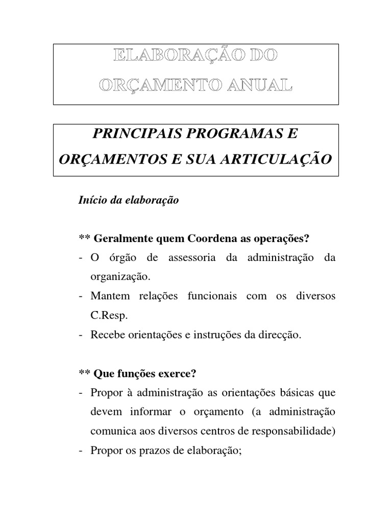 ** Que funes exerce? - Propor administrao as orientaes bsicas que devem informar o oramento (a administrao comunica aos diversos centros de responsabilidade) - Propor os prazos de elaborao;
