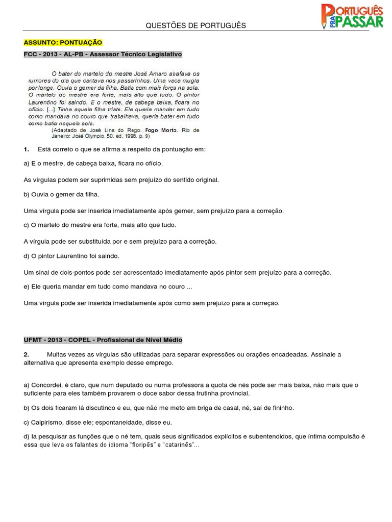 a) E o mestre, de cabea baixa, ficara no ofcio. As vrgulas podem ser suprimidas sem prejuzo do sentido original. b) Ouvia o gemer da filha. Uma vrgula pode ser inserida imediatamente aps gemer, sem prejuzo para a correo. c) O martelo do mestre era forte, mais alto que tudo. A vrgula pode ser substituda por e sem prejuzo para a correo. d) O pintor Laurentino foi saindo. Um sinal de dois-pontos pode ser acrescentado imediatamente aps pintor sem prejuzo para a correo. e) Ele queria mandar em tudo como mandava no couro ... Uma vrgula pode ser inserida imediatamente aps como sem prejuzo para a correo.