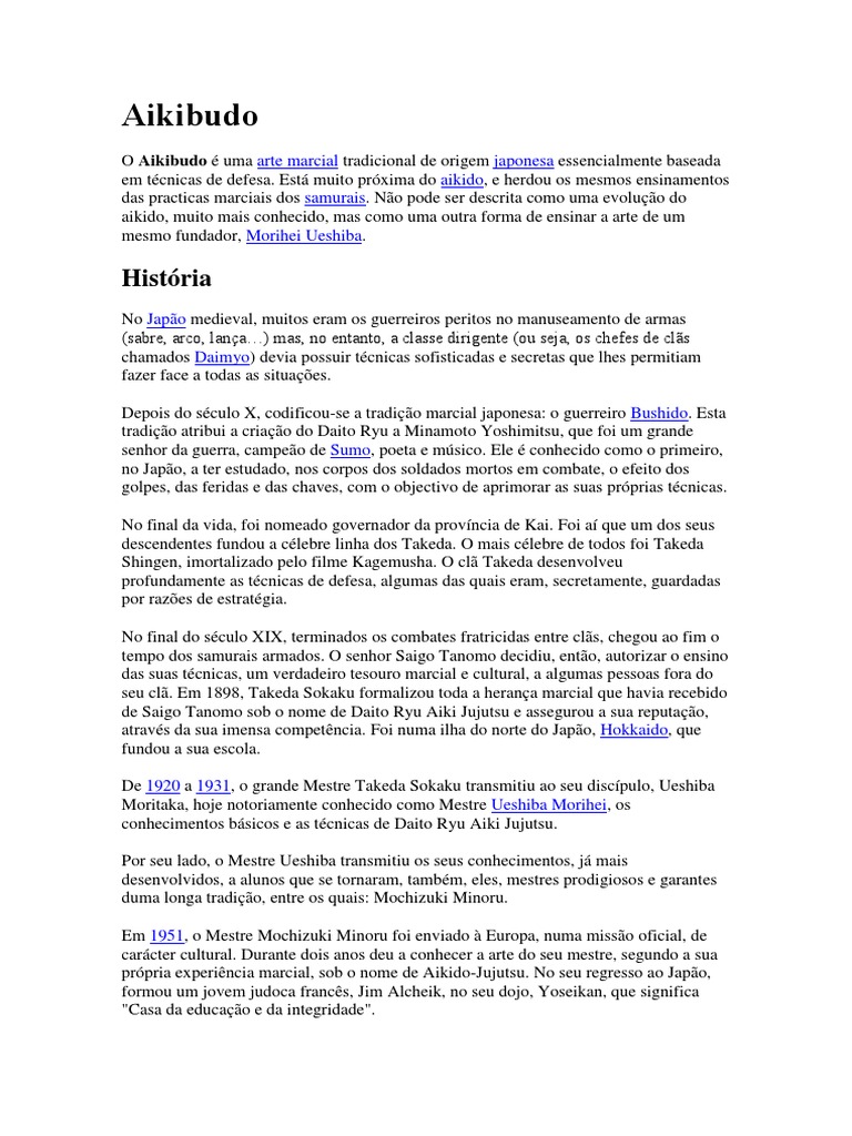No Japo medieval, muitos eram os guerreiros peritos no manuseamento de armas (sabre, arco, lana) mas, no entanto, a classe dirigente (ou seja, os chefes de cls chamados Daimyo) devia possuir tcnicas sofisticadas e secretas que lhes permitiam fazer face a todas as situaes. Depois do sculo X, codificou-se a tradio marcial japonesa: o guerreiro Bushido. Esta tradio atribui a criao do Daito Ryu a Minamoto Yoshimitsu, que foi um grande senhor da guerra, campeo de Sumo, poeta e msico. Ele conhecido como o primeiro, no Japo, a ter estudado, nos corpos dos soldados mortos em combate, o efeito dos golpes, das feridas e das chaves, com o objectivo de aprimorar as suas prprias tcnicas. No final da vida, foi nomeado governador da provncia de Kai. Foi a que um dos seus descendentes fundou a clebre linha dos Takeda. O mais clebre de todos foi Takeda Shingen, imortalizado pelo filme Kagemusha. O cl Takeda desenvolveu profundamente as tcnicas de defesa, algumas das quais eram, secretamente, guardadas por razes de estratgia. No final do sculo XIX, terminados os combates fratricidas entre cls, chegou ao fim o tempo dos samurais armados. O senhor Saigo Tanomo decidiu, ento, autorizar o ensino das suas tcnicas, um verdadeiro tesouro marcial e cultural, a algumas pessoas fora do seu cl. Em 1898, Takeda Sokaku formalizou toda a herana marcial que havia recebido de Saigo Tanomo sob o nome de Daito Ryu Aiki Jujutsu e assegurou a sua reputao, atravs da sua imensa competncia. Foi numa ilha do norte do Japo, Hokkaido, que fundou a sua escola. De 1920 a 1931, o grande Mestre Takeda Sokaku transmitiu ao seu discpulo, Ueshiba Moritaka, hoje notoriamente conhecido como Mestre Ueshiba Morihei, os conhecimentos bsicos e as tcnicas de Daito Ryu Aiki Jujutsu. Por seu lado, o Mestre Ueshiba transmitiu os seus conhecimentos, j mais desenvolvidos, a alunos que se tornaram, tambm, eles, mestres prodigiosos e garantes duma longa tradio, entre os quais: Mochizuki Minoru. Em 1951, o Mestre Mochizuki Minoru foi enviado Europa, numa misso oficial, de carcter cultural. Durante dois anos deu a conhecer a arte do seu mestre, segundo a sua prpria experincia marcial, sob o nome de Aikido-Jujutsu. No seu regresso ao Japo, formou um jovem judoca francs, Jim Alcheik, no seu dojo, Yoseikan, que significa "Casa da educao e da integridade".