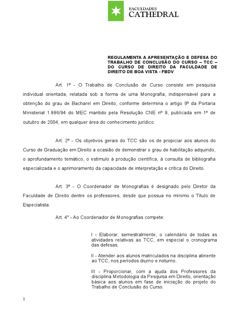 Art. 1 - O Trabalho de Concluso de Curso consiste em pesquisa individual orientada, relatada sob a forma de uma Monografia, indispensvel para a obteno do grau de Bacharel em Direito, conforme determina o artigo 9 da Portaria Ministerial 1.886/94 do MEC mantido pela Resoluo CNE n 9, publicada em 1 de outubro de 2004, em qualquer rea do conhecimento jurdico.