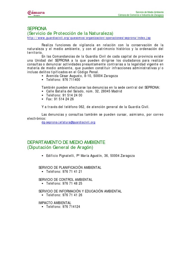 Realiza funciones de vigilancia en relación con la conservación de la naturaleza y el medio ambiente, y con el patrimonio histórico y la ordenación del territorio. En las Comandancias de la Guardia Civil de cada capital de provincia existe una Unidad del SEPRONA a la que pueden dirigirse los ciudadanos para realizar consultas o denunciar actividades presuntamente contrarias a la legalidad vigente en materia de medio ambiente, que pueden constituir infracciones administrativas y/o incluso delitos tipificados en el Código Penal. Avenida César Augusto, 8-10, 50004 Zaragoza Teléfono: 976 711400 También pueden efectuarse las denuncias en la sede central del SEPRONA: Calle Batalla del Salado, núm. 32, 28045 Madrid Teléfono: 91 514 24 00 Fax: 91 514 24 26 Y a través del teléfono 062, de atención general de la Guardia Civil. Las denuncias y consultas también se pueden cursar, asimismo, por correo electrónico: