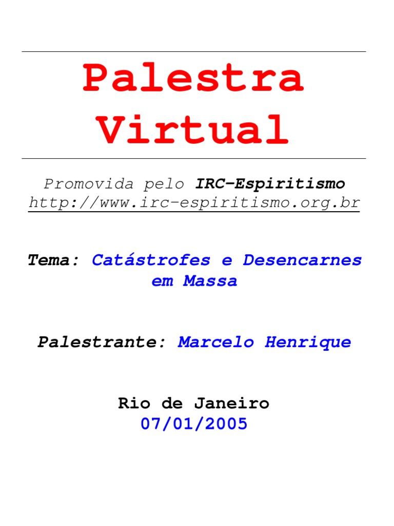 membro da Associação Brasileira de Divulgadores do Espiritismo (Abrade) e da Confederação Espírita Pan-Americana (CEPA). É um prazer poder estar com vocês, no esforço conjunto de entendermos melhor as contingências dos acontecimentos que envolvem nossa vida material e espiritual espero que possamos aprender e nos instruir, com a ajuda dos nossos amigos espirituais. Nosso tema é "Catástrofes e desencarnes em massa: a visão espírita" agradecemos o convite do pessoal do IRC-Espiritismo e saudamos a todos com especial carinho. Enquanto grande parte do mundo estava envolto nas comemorações natalinas, entre sorrisos, cumprimentos e presentes, a região asiática chorava a dor da destruição de cidades e a perda dos entes queridos. Estimativas não- oficiais apontam para o desencarne em massa de mais de 140 mil pessoas, num dos maiores cataclismos que atingiram a região, um terremoto que originou um maremoto. Imagens televisivas, virtuais ou impressas nos mostram as tintas do drama de nossos irmãos, e enquanto a população recolhe seus mortos, implora auxílio internacional para o socorro aos sobreviventes e a futura reconstrução de casas, prédios, espaços e repartições públicas. A solidariedade fraternal do mundo fica explícita nas ações de grupos estatais e não-governamentais que remetem remédios e equipamentos clínicos, alimentos, água potável e cobertores, em paralelo aos inúmeros voluntários das cruzadas internacionais de saúde, que atendem às vítimas, no digno exemplo de quem se importa com o semelhante e faz o possível para minorar a dor alheia. A filosofia espírita, debruçando-se sobre o tema que envolve os chamados desencarnes em massa, permite que entabulemos a seguinte digressão: “[...] a destruição é uma necessidade para a regeneração moral dos Espíritos“, a teor do contido no quesito 737 de O livro dos espíritos. Há,assim, três núcleos semânticos no trecho achado: destruição, necessidade e regeneração moral. Até que ponto os compreendemos na totalidade, à luz da lógica espírita? (t) Perguntas/Respostas: