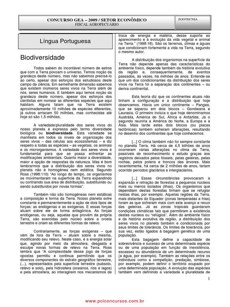 (d) o sujeito que concorda com o verbo é constituído por um pronome indefinido. todos os seres vivos da Terra “descendem de um número muito menor (talvez um único) [de espécies] que existiu em algum tempo remoto no passado”. (b) estão estruturados em torno de nomes e locução verbal. (a) apenas vegetais e animais. (b) paradoxal. (b) essa distribuição abrange prioritariamente o ambiente físico.com. subjetividade e ordenação tipológica da versificação. tipologia predominantemente argumentativa. QUESTÃO 10 Tome por base os dois trechos seguintes para esta questão: “A variedade/pluralidade dos seres vivos do nosso planeta é expressa pelo termo diversidade biológica ou biodiversidade”/ “A mudança nas características de subpopulações isoladas (ou a divergência ecológica) é explicada por dois fatos. A leitura do trecho permite compreender que (a) provavelmente os seres da terra sejam originados de uma só espécie. comprovação de alguns fatos. (c) as células e todas as espécies presentes nos ecossistemas.pciconcursos. (e) tal distribuição depende mais de fatos presentes do que de fatos passados para ser compreendida. QUESTÃO 7 Considere o fragmento seguinte para responder esta questão: “Nosso planeta sofre constante e permanentemente a ação de dois tipos de forças: as endógenas e as exógenas.CONCURSO GEA – 2009 / SETOR ECONÔMICO FISCAL AGROPECUÁRIO QUESTÃO 4 O texto em questão. QUESTÃO 6 O texto nos possibilita biodiversidade envolve entender que a ZOOTECNIA Os vocábulos “endógenas” e apresentam entre eles uma relação (a) simultânea. objetividade. clareza na exposição das idéias. (c) o sujeito do discurso não participa da ação verbal. (d) linguagem precisa.” A terminação verbal em “sabemos” evidencia que (a) o sujeito discursivo inclui-se na ação apresentada. (b) cientificamente é certo que todos os seres vivos originaram-se de um grupo só. ordenação tipológica predominante expositiva. concisão e fidelidade às fontes citadas. é caracterizado por (a) linguagem objetiva.) Para Ricklefs. (e) linguagem indireta. (e) especialmente a flora e a fauna terrestre.br . circularidades. QUESTÃO 8 “exógenas” Sobre a distribuição dos organismos na superfície terrestre podemos afirmar que (a) tal distribuição deve-se exclusivamente à separação dos continentes (deriva continental).. (c) a referida distribuição depende primordialmente da história evolutiva da região. (b) a concordância ocorre entre a referida forma verbal e o sujeito explícito na sentença. subjetividade e ordenação tipológica predominantemente injuntiva. (c) os cientistas são unânimes em defender que os seres vivos são originados de uma só espécie. (e) causa – consequência. (b) linguagem indireta. (d) sinonímica. (d) exclusivamente células e microorganismos. QUESTÃO 5 Considere o trecho: “(. (d) a deriva continental representa um dos fatores responsáveis por aquela distribuição. (e) a concordância se dá entre o verbo e a 3ª pessoa do plural. um artigo científico. QUESTÃO 9 No trecho “Todos sabemos do incontável número de astros que com a Terra povoam o universo. fatos controversos e ordenação tipológica descritivo-injuntiva. (c) linguagem indireta. (b) somente células e vegetais.” 3 www. (e) todas as espécies são originadas de outras que existiram num passado remoto. (c) metafórica.” Sobre a organização estrutural desses fragmentos é válido afirmar que (a) são formados em sua maior parte por palavras compostas. (d) os seres vivos são de origem diversa..