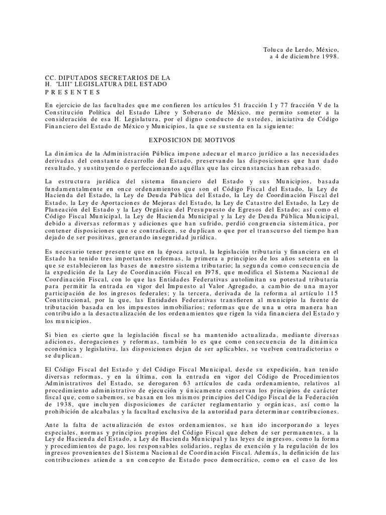 CC. DIPUTADOS SECRETARIOS DE LA H. "LIII" LEGISLATURA DEL ESTADO PRESENTES En ejercicio de las facultades que me confieren los artculos 51 fraccin I y 77 fraccin V de la Constitucin Poltica del Estado Libre y Soberano de Mxico, me permito someter a la consideracin de esa H. Legislatura, por el digno conducto de ustedes, iniciativa de Cdigo Financiero del Estado de Mxico y Municipios, la que se sustenta en la siguiente: EXPOSICION DE MOTIVOS La dinmica de la Administracin Pblica impone adecuar el marco jurdico a las necesidades derivadas del constante desarrollo del Estado, preservando las disposiciones que han dado resultado, y sustituyendo o perfeccionando aqullas que las circunstancias han rebasado. La estructura jurdica del sistema financiero del Estado y sus Municipios, basada fundamentalmente en once ordenamientos que son el Cdigo Fiscal del Estado, la Ley de Hacienda del Estado, la Ley de Deuda Pblica del Estado, la Ley de Coordinacin Fiscal del Estado, la Ley de Aportaciones de Mejoras del Estado, la Ley de Catastro del Estado, la Ley de Planeacin del Estado y la Ley Orgnica del Presupuesto de Egresos del Estado; as como el Cdigo Fiscal Municipal, la Ley de Hacienda Municipal y la Ley de Deuda Pblica Municipal, debido a diversas reformas y adiciones que han sufrido, perdi congruencia sistemtica, por contener disposiciones que se contradicen, se duplican o que por el transcurso del tiempo han dejado de ser positivas, generando inseguridad jurdica. Es necesario tener presente que en la poca actual, la legislacin tributaria y financiera en el Estado ha tenido tres importantes reformas, la primera a principios de los aos setenta en la que se establecieron las bases de nuestro sistema tributario; la segunda como consecuencia de la expedicin de la Ley de Coordinacin Fiscal en I978, que modifica el Sistema Nacional de Coordinacin Fiscal, con lo que las Entidades Federativas autolimitan su potestad tributaria para permitir la entrada en vigor del Impuesto al Valor Agregado, a cambio de una mayor participacin de los ingresos federales; y la tercera, derivada de la reforma al artculo 115 Constitucional, por la que, las Entidades Federativas transfieren al municipio la fuente de tributacin basada en los impuestos inmobiliarios; reformas que de una u otra manera han contribuido a la desactualizacin de los ordenamientos que rigen la vida financiera del Estado y los municipios. Si bien es cierto que la legislacin fiscal se ha mantenido actualizada, mediante diversas adiciones, derogaciones y reformas, tambin lo es que como consecuencia de la dinmica econmica y legislativa, las disposiciones dejan de ser aplicables, se vuelven contradictorias o se duplican. El Cdigo Fi scal del Estado y del Cdigo Fiscal Municipal, desde su expedicin, han tenido diversas reformas, y en la ltima, con la entrada en vigor del Cdigo de Procedimientos Administrativos del Estado, se derogaron 63 artculos de cada ordenamiento, relativos al procedimiento administrativo de ejecucin y nicamente conservan los principios de carcter fiscal que, como sabemos, se basan en los mismos principios del Cdigo Fiscal de la Federacin de 1938, que incluyen disposiciones de carcter reglamentario y orgnicas, as como la prohibicin de alcabalas y la facultad exclusiva de la autoridad para determinar contribuciones. Ante la falta de actualizacin de estos ordenamientos, se han ido incorporando a leyes especiales, normas y principios propios del Cdigo Fiscal que deben de ser permanentes, a la Ley de Hacienda del Estado, a Ley de Hacienda Municipal y las leyes de ingresos, como la forma y procedimientos de pago, los responsables solidarios, reglas de exencin y la regulacin de los ingresos provenientes de l Sistema Nacional de Coordinacin Fiscal. Adems, la definicin de las contribuciones atiende a un concepto de Estado poco democrtico, como en el caso de los